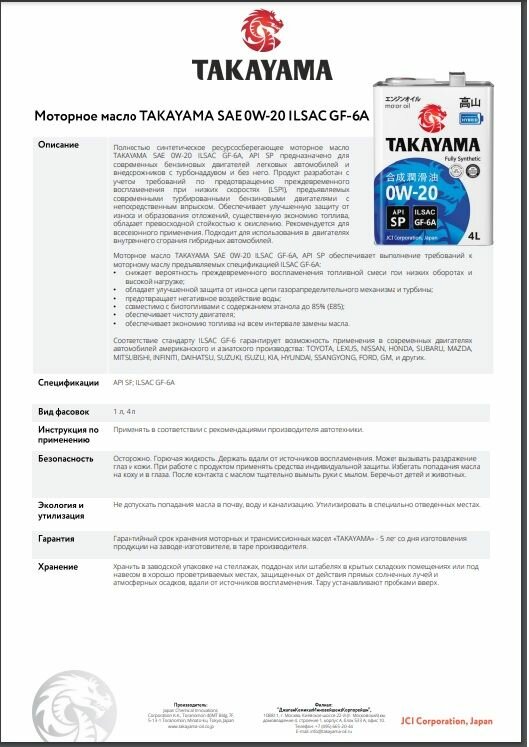 СохранитьTAKAYAMA 605038 TAKAYAMA SAE 0W-20 ILSAC GF-5, API SN 1 интересное: