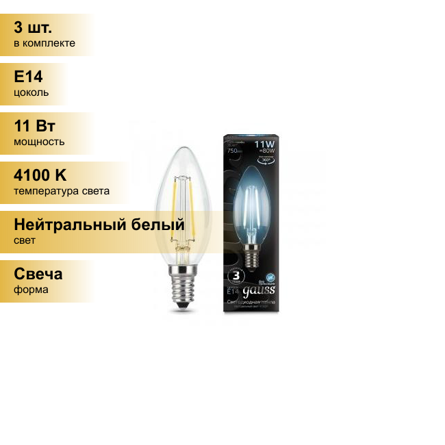 Купить (3 шт.) Светодиодная лампочка Gauss Filament Свеча E14 11W 750lm 4100K 4K прозр. филамент (нитевидная) 103801211 Нейтральный белый. Цоколь E14