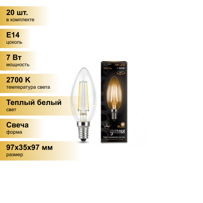 Купить (20 шт.) Светодиодная лампочка Gauss Filament Свеча E14 7W(550lm) 2700K 2K прозр. 97x35 филамент (нитевидная), 103801107 Теплый белый. Цоколь E14