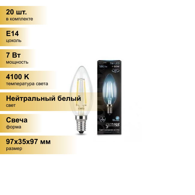 Сохранить(20 шт.) Светодиодная лампочка Gauss Filament Свеча E14 7W(580lm) 4100K 4K прозр. 97x35 филамент (нитевидная), 103801207 Нейтральный белый. Цоколь E14 интересное: