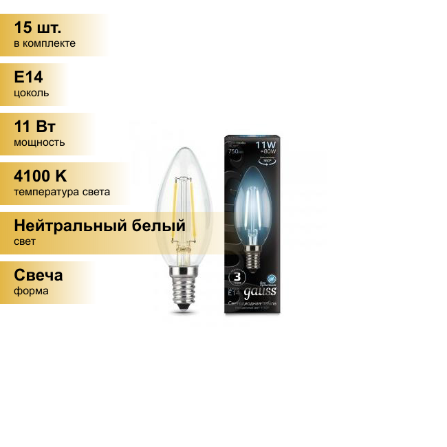 Сохранить(15 шт.) Светодиодная лампочка Gauss Filament Свеча E14 11W 750lm 4100K 4K прозр. филамент (нитевидная) 103801211 Нейтральный белый. Цоколь E14 интересное: