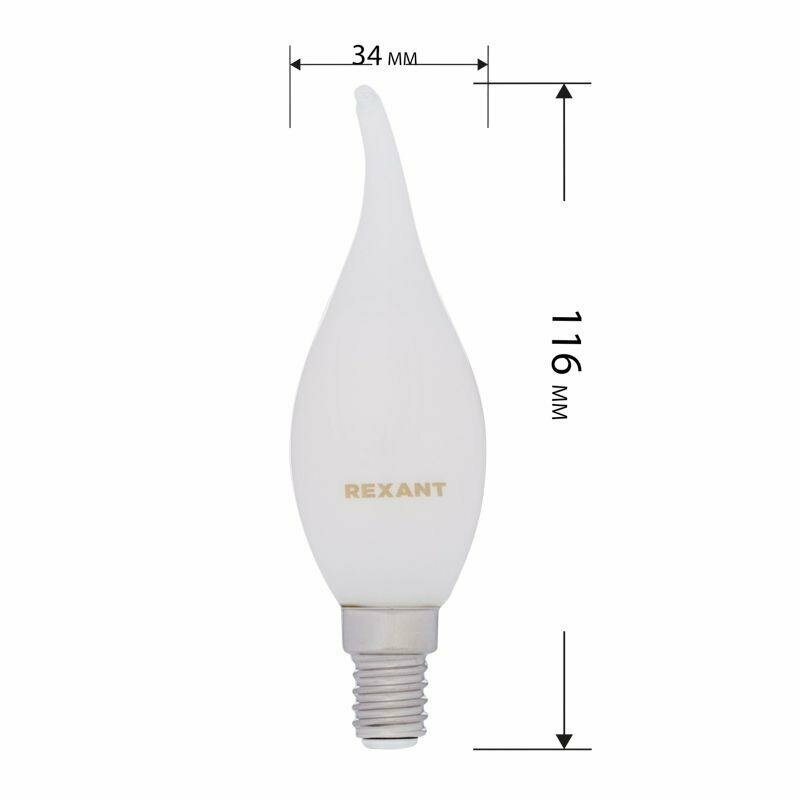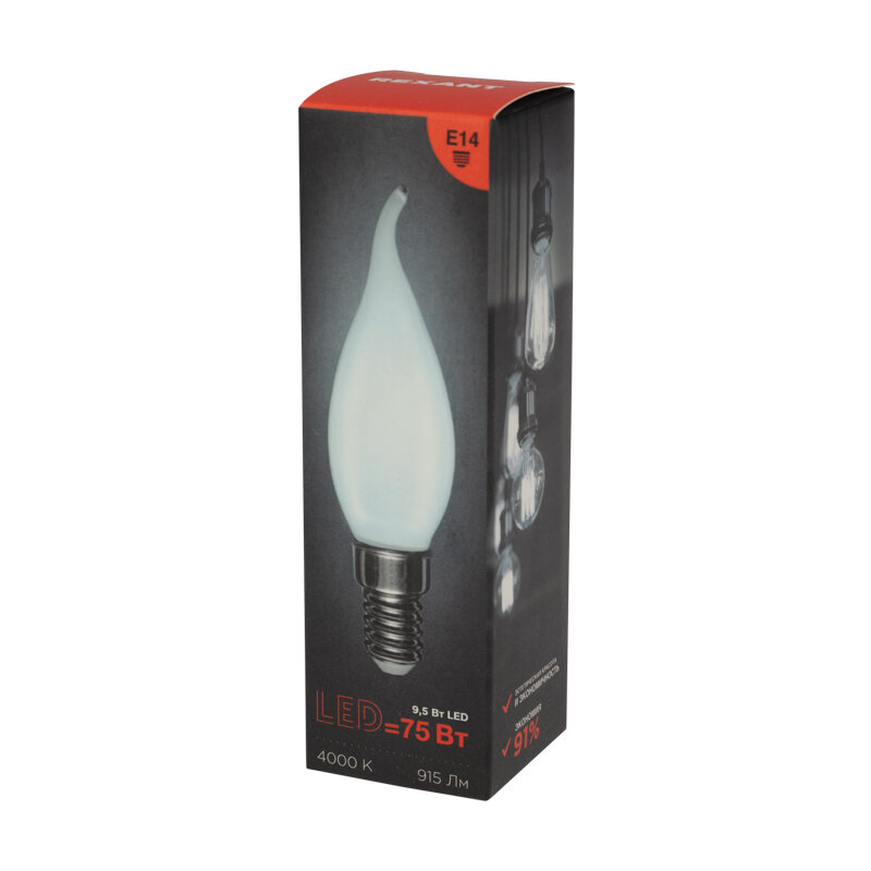 Лампа филаментная REXANT Свеча на ветру CN37, 9.5 Вт, 915 Лм, 4000K, E14 в матовой колбе