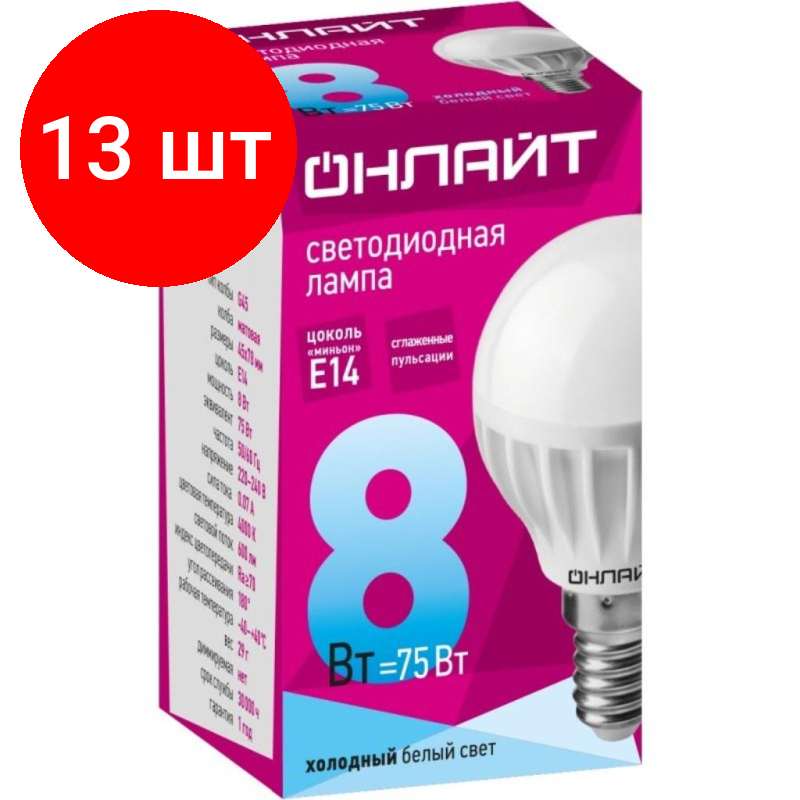 Купить Комплект 13 штук, Лампа светодиодная онлайт OLL-G45-8-230-4K-E14 8Вт Е14 4000К 71625
