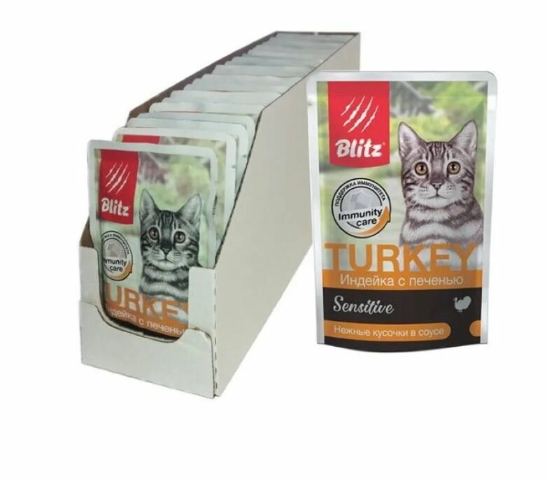 Корм Blitz Sensitive Turkey (в соусе) для кошек, индейка с печенью, 85 г x 24 шт