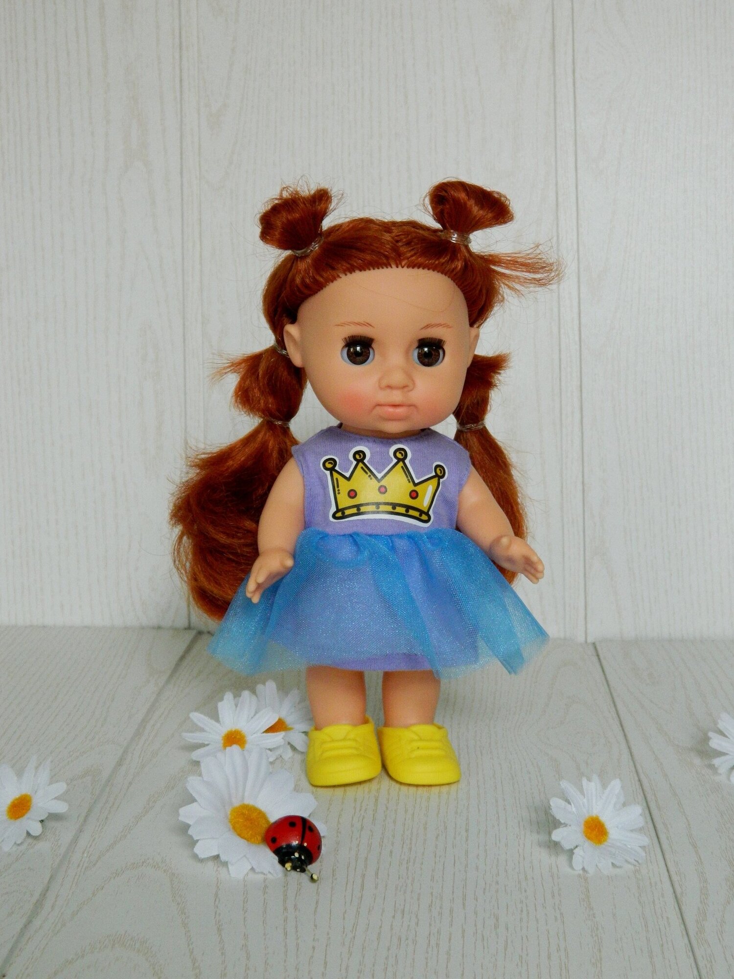| Дополнительная информация | длина волос — 14 см; в комплект одежды входит: платье из трикотажа и сетки; на груди наклейка — корона; застёжка сзади на липкую ленту, на ногах туфельки |