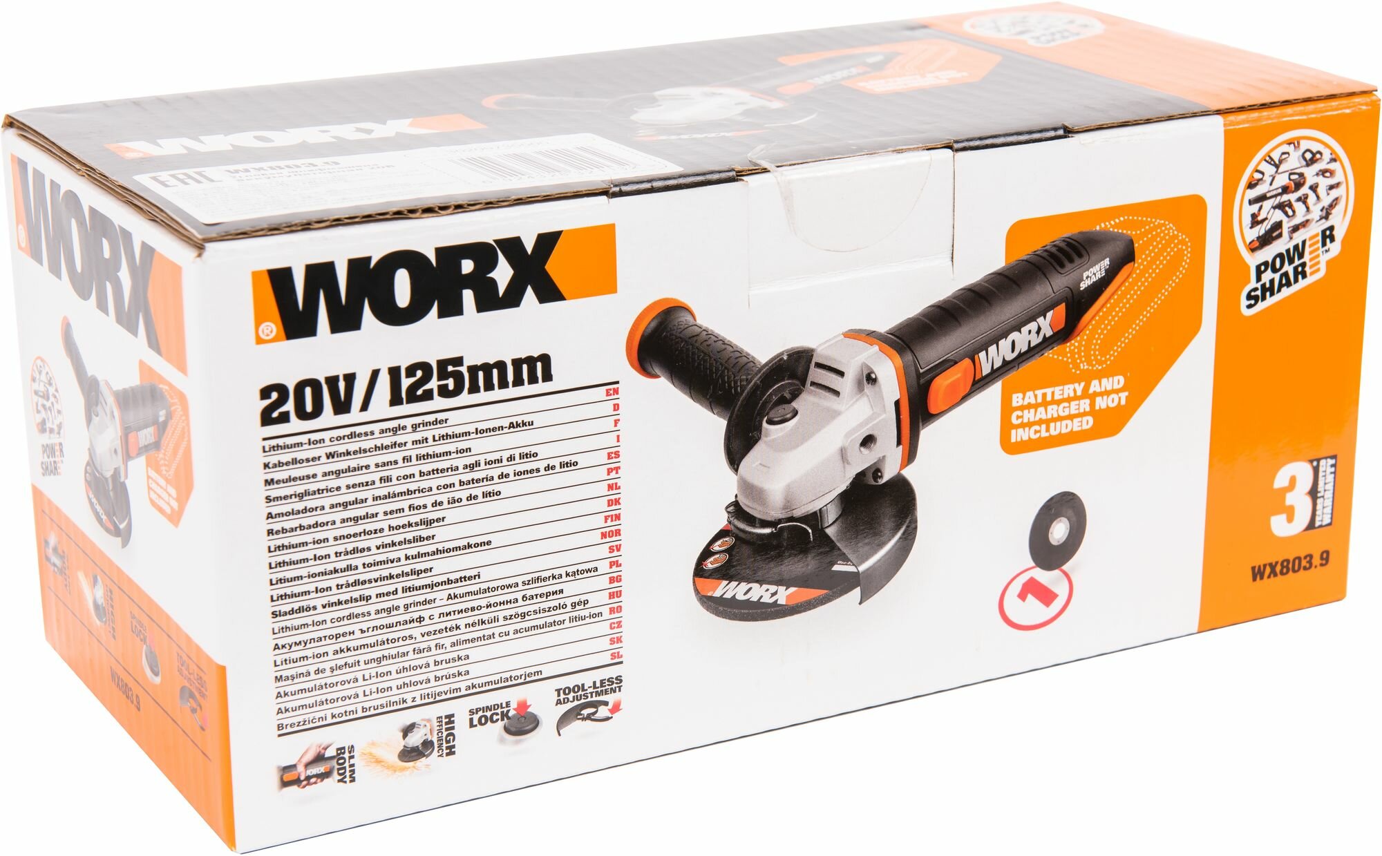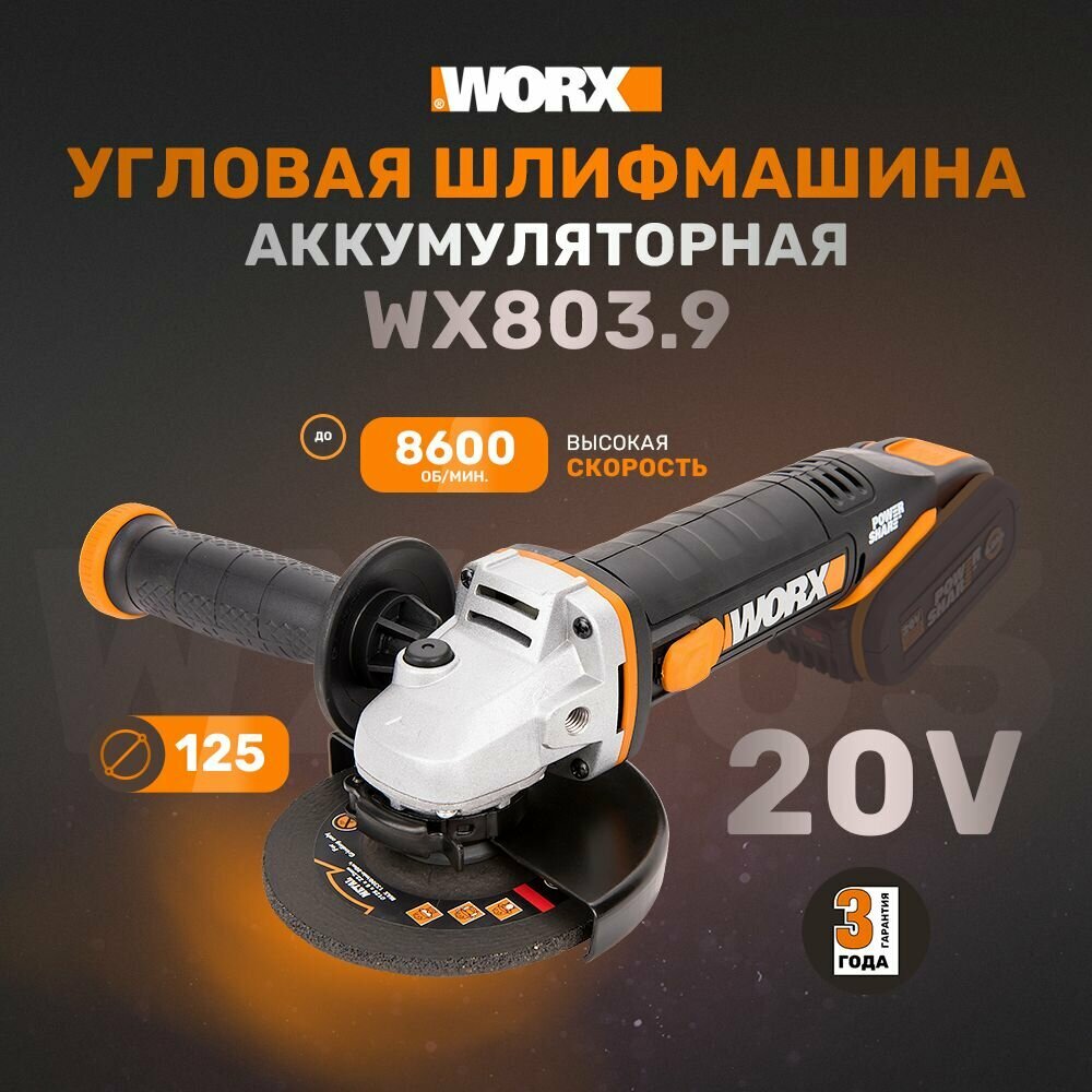 Угловая шлифмашина аккумуляторная WORX WX803.9, 125 мм, 20 В, без АКБ и ЗУ, коробка