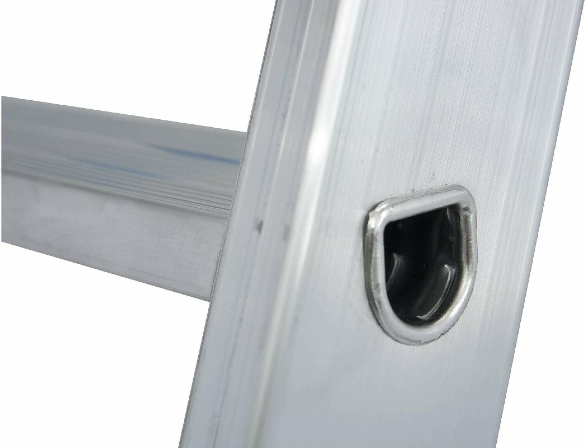 | Дополнительная информация | заменяемая полка для инструментов с крюком для ведра; опорная часть с прочными поперечными распорками; защитные верхние заглушки на опорной части лестницы исключают защемление при раздвижении стремянки |