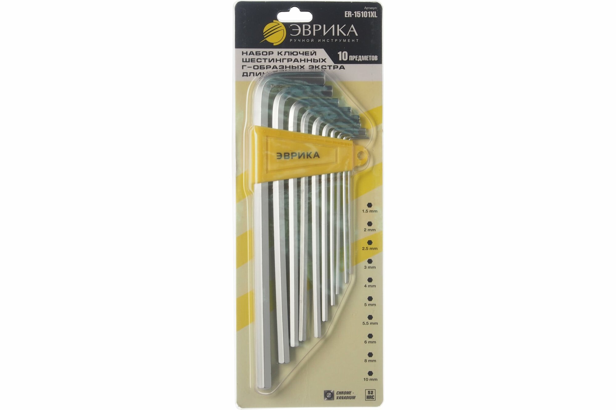 Набор ключей шестигранных 1.5-10мм Г-образных экстрадлинных 10 предметов, ER-15101XL, эврика