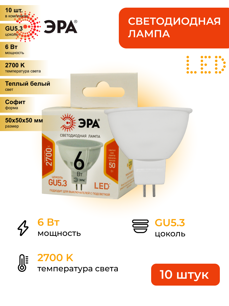 Лампочка светодиодная ЭРА (набор 10 штук) STD LED MR16-6W-840-GU5.3 GU5.3 6 ВТ софит нейтральный белый СВEТ