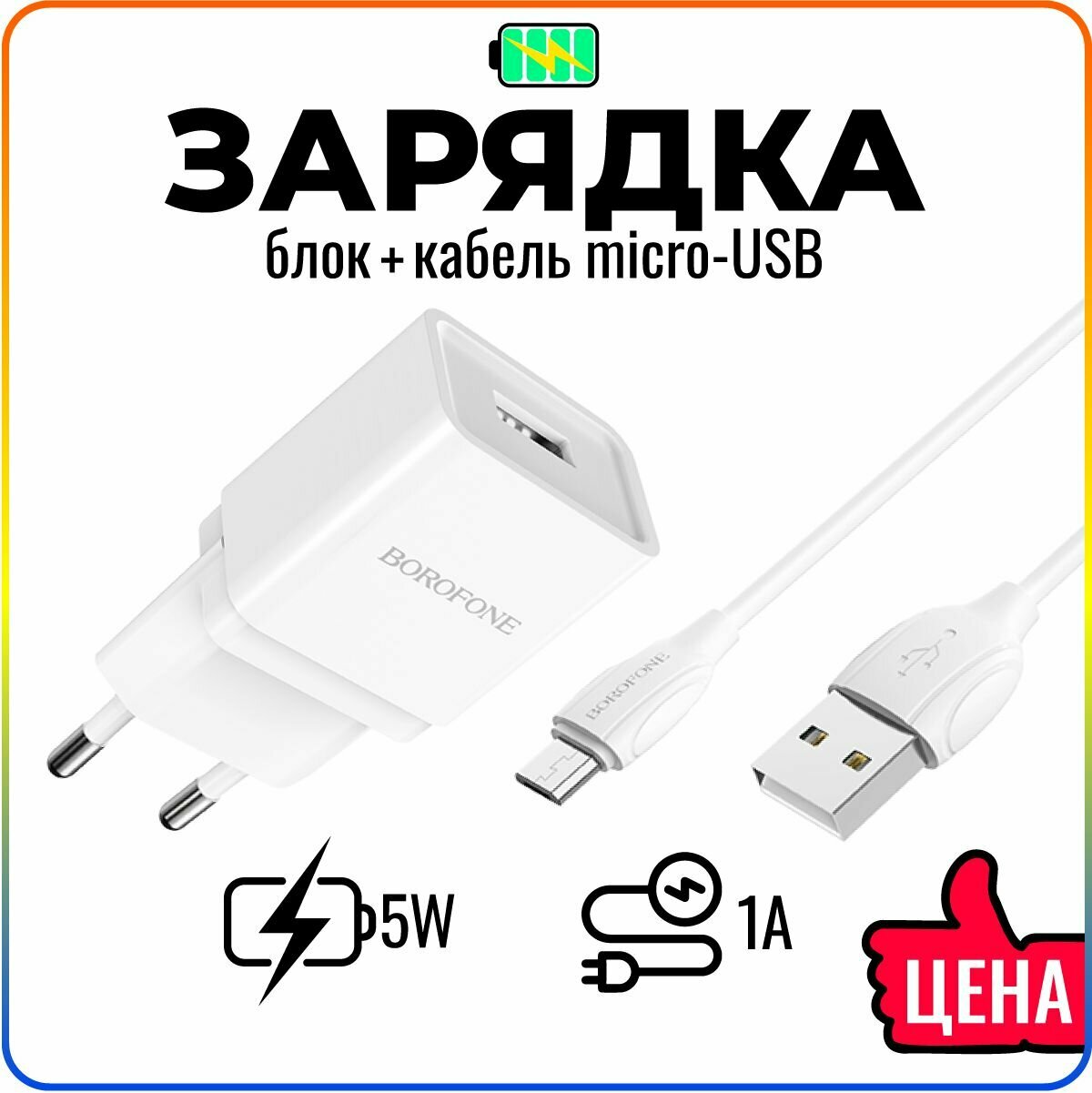 Зарядка для телефона BOROFONE BA19A Nimble 1xUSB, 1А + кабель MicroUSB, 1м (белый)
