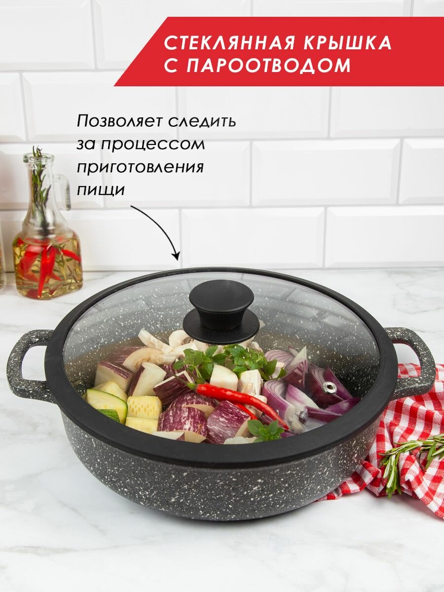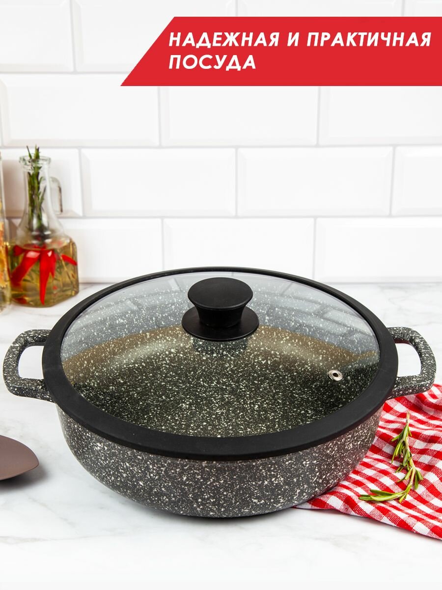 Жаровня антипригарная литая со стеклянной крышкой ( силиконовый ободок) 26 см Гранит ТМ Традиция готовить с любовью