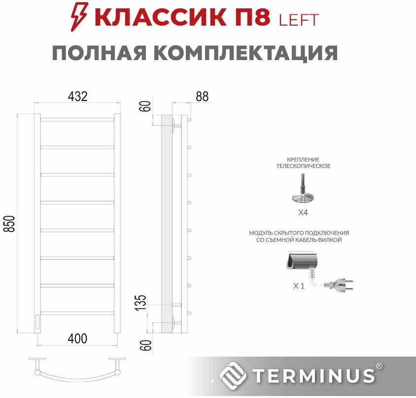 Полотенцесушитель электрический левый TERMINUS (Терминус) Классик П8 400х850мм, нержавеющая сталь, диммер,таймер, гарантия 5 лет