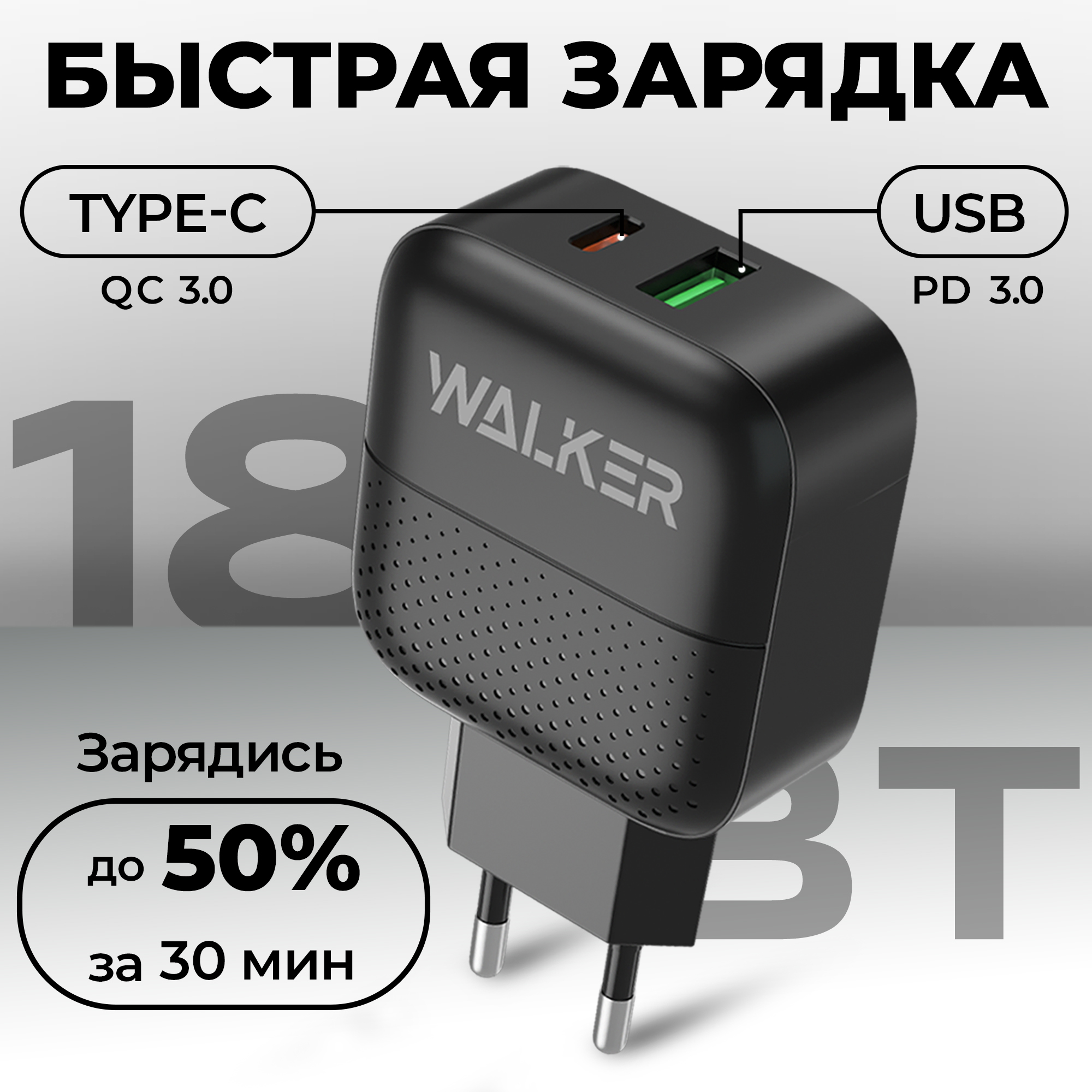 Зарядное устройство для телефона с быстрым зарядом, разъёмы USB и Type-C по 3.4A и мощностью по 18W, WALKER, WH-37, черное / сетевая зарядка, блок