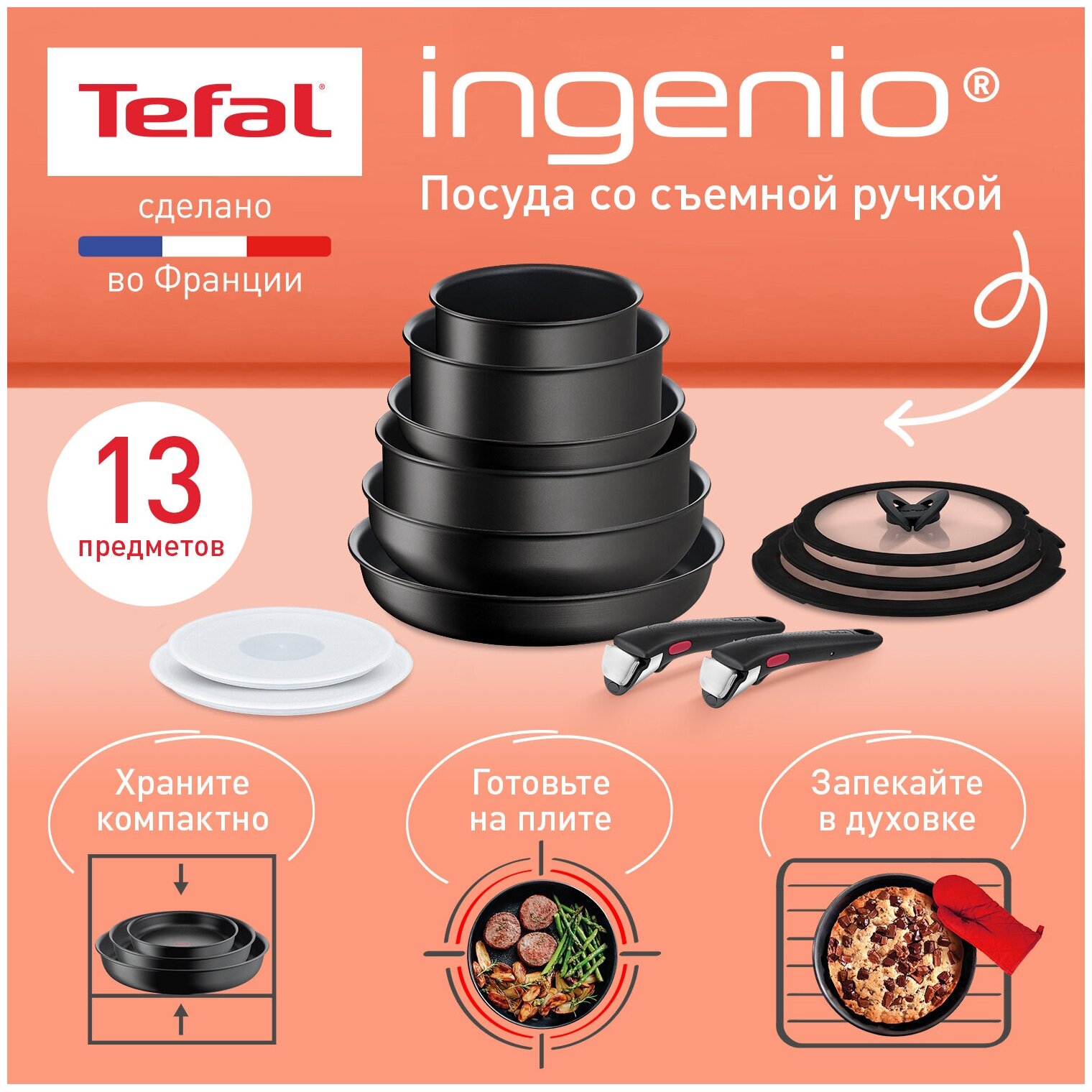 Набор посуды со съемной ручкой Tefal Ingenio Unlimited L7639002, 13 предметов, подходит для индукции
