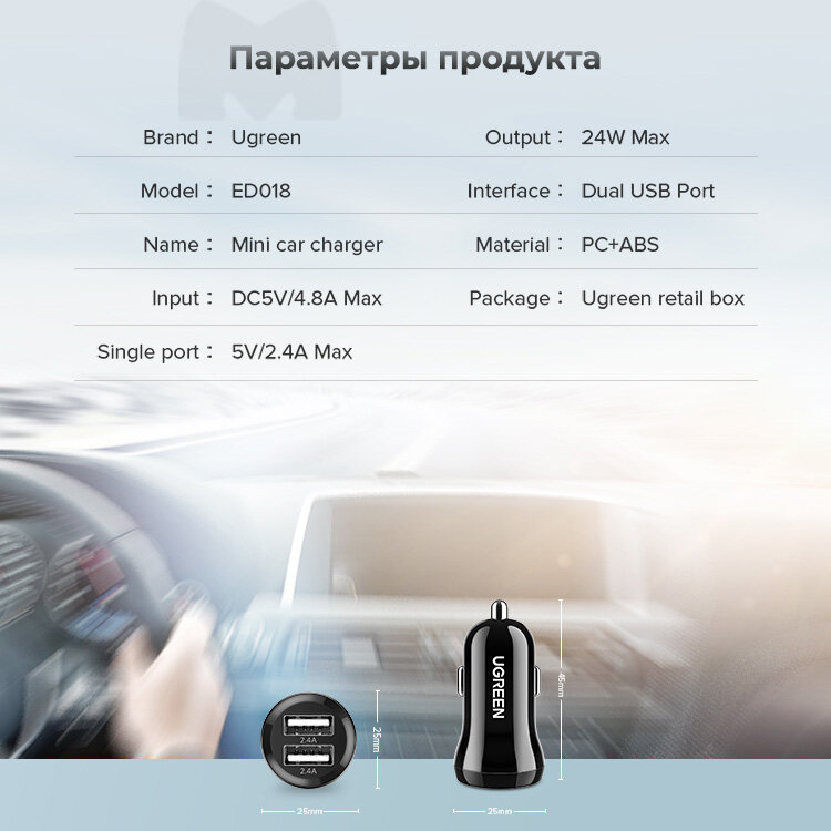Ниже Вы можете прочитать отзывы на Автомобильное зарядное устройство 24Вт UGREEN ED018 / 2xUSB-A 2.4A / Мини размер / цвет черный (50875), ознакомится с подробными характеристиками, посмотреть интересные обзоры и фотографии на Автомобильное зарядное устройство 24Вт UGREEN ED018 / 2xUSB-A 2.4A / Мини размер / цвет черный (50875).