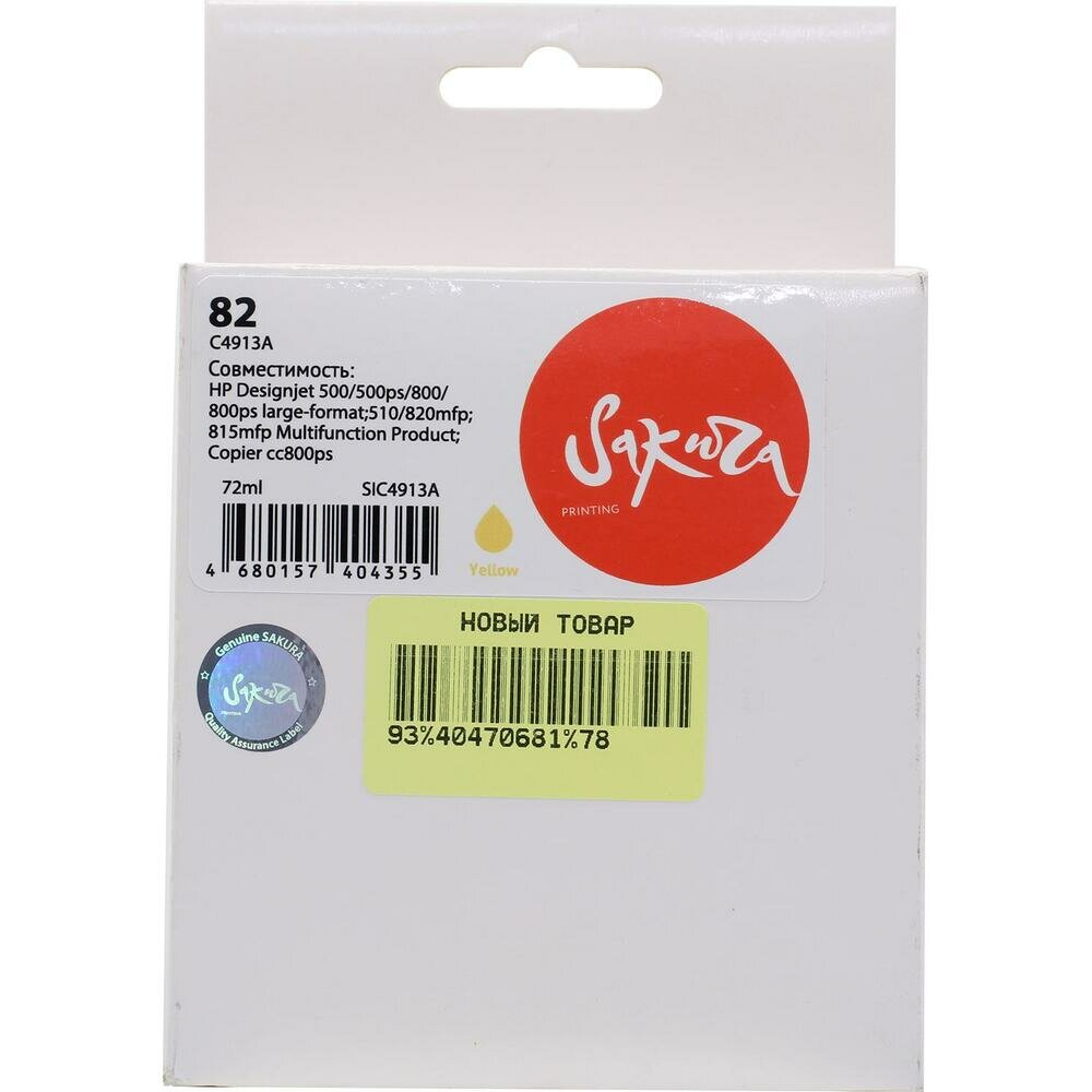 Картридж струйный Sakura 82 / C4913A желтый, водорастворимый тип, 72 мл. для HP (SIC4913A)