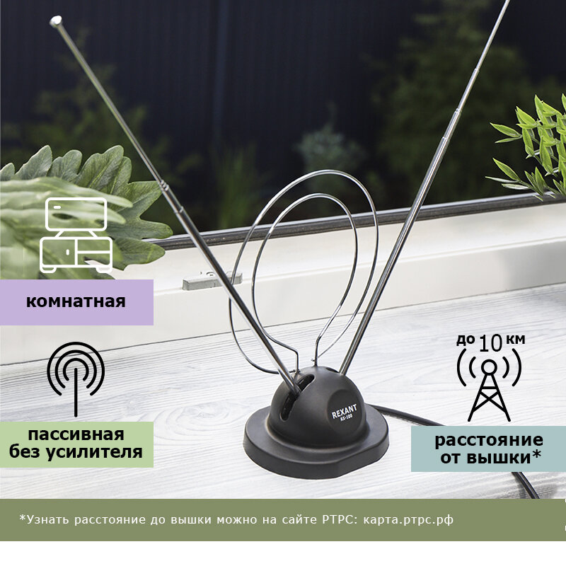 Антенна комнатная Rexant RX-100 телескопическая, на подставке, с кольцом