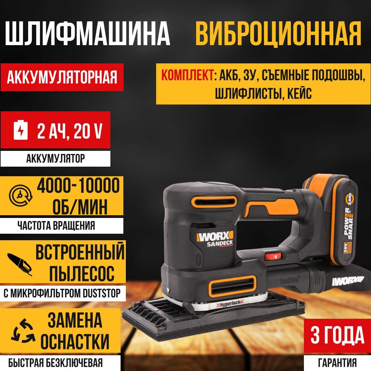Виброшлифмашина аккумуляторная WORX WX820, 20В, 2 Ач х1, кейс