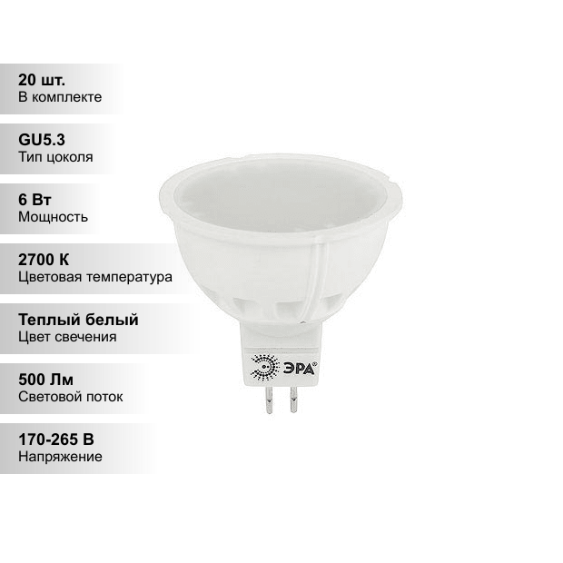 Купить (20 шт.) Светодиодная лампочка ЭРА MR16, мощность 6Вт, напряжение питания 170-265 В, цветовая температура 2700 K, теплый белый свет, цоколь GU5.3