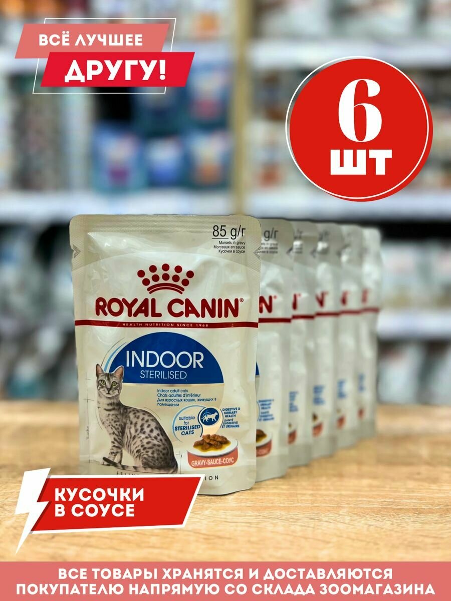 Royal Canin Indoor Sterilised для постоянно живущих в помещении, кусочки в соусе (6шт по 85г)