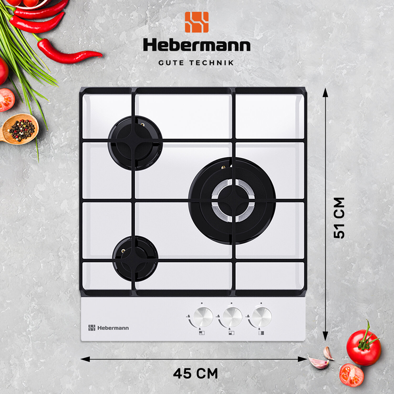 Варочная панель газовая Hebermann HBGG 453.1 W,ширина 45 см, закаленное стекло, 3 конфорки, 6250 Вт
