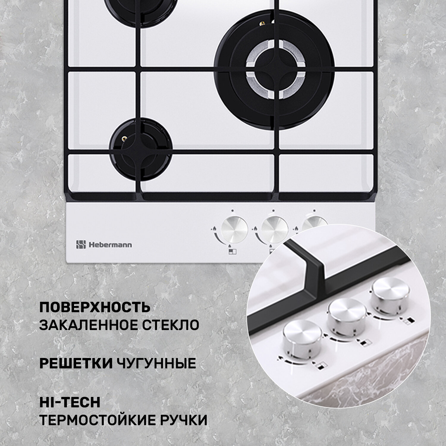 Купить Варочная панель газовая 3 конфорки Hebermann HBGG 453.1 W, материал поверхности: закалённое стекло, материал решёток: чугун, термостойкие ручки -Hitech, электроподжиг, газ-контроль