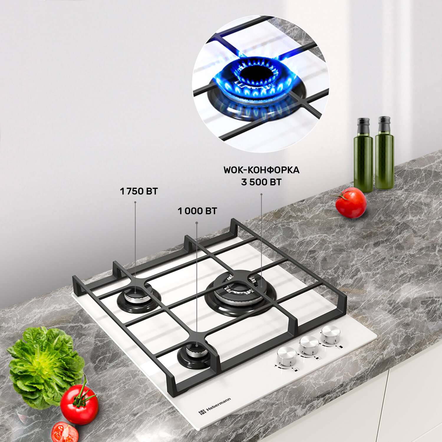 СохранитьВарочная панель газовая 3 конфорки Hebermann HBGG 453.1 W, материал поверхности: закалённое стекло, материал решёток: чугун, термостойкие ручки -Hitech, электроподжиг, газ-контроль интересное: