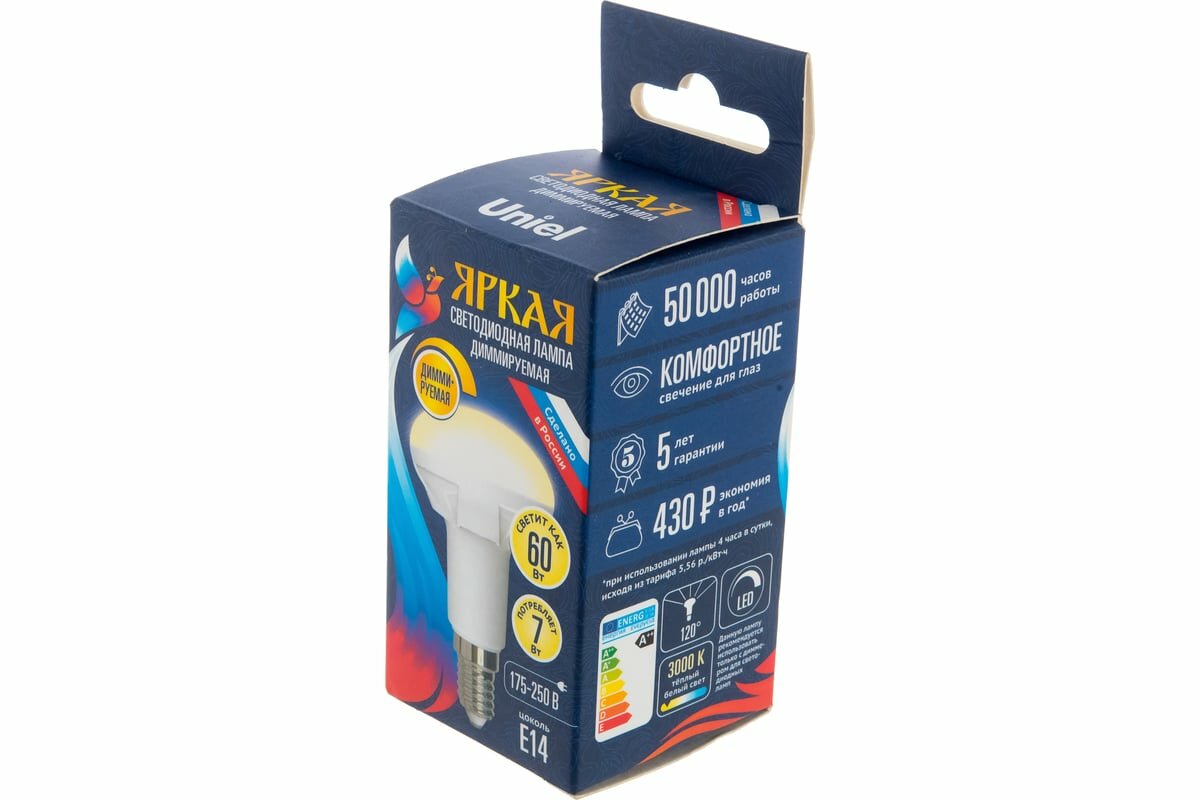 Светодиодная лампа Uniel LED-R50 7W/3000K/E14/FR/DIM PLP01WH диммируемая. Форма "Рефлектор", матовая. Серия Яркая. Теплый белый свет (3000K). Картон. ТМ Uni