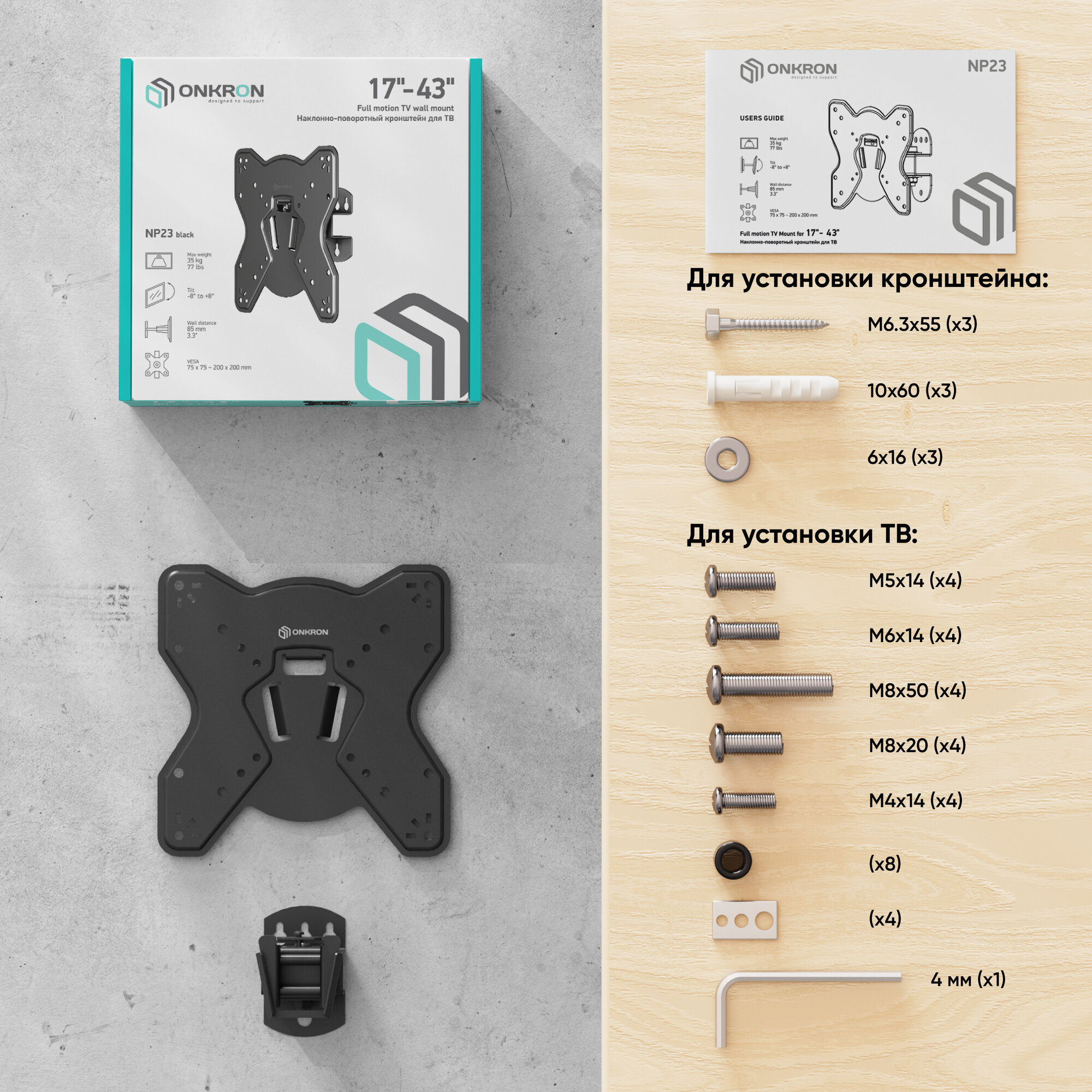 Кронштейн для телевизора 17"-43" ONKRON NP23 наклонно-поворотный, чёрный