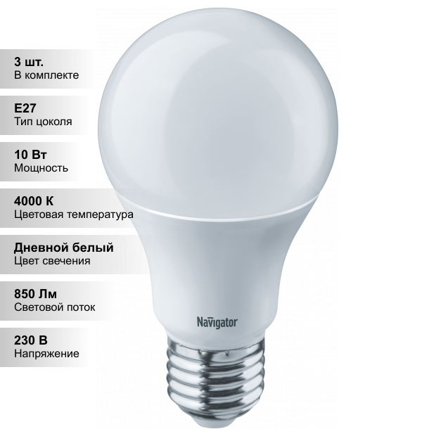 Купить (3 шт.) Светодиодная лампочка Navigator A60 10Вт 230В 4000K E27 диммир.