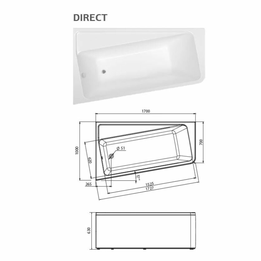Ванна акриловая асимметричная 1MarKa Direct R 1700х1000 белый (01дир1710п)