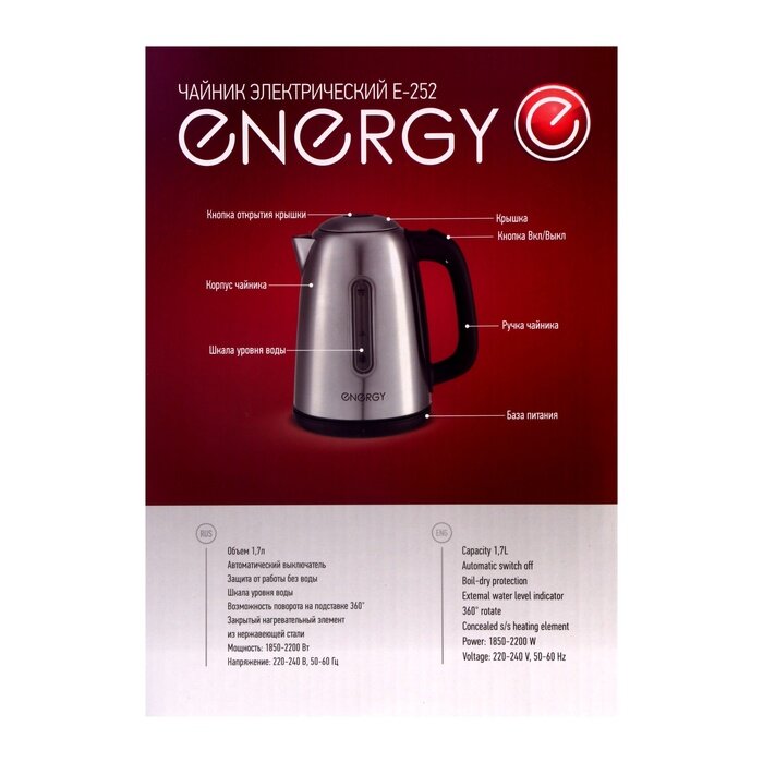 Ниже Вы можете прочитать отзывы на Чайник электрический Energy E-252, металл, 1.7 л, 2200 Вт, серебристый, ознакомится с подробными характеристиками, посмотреть интересные обзоры и фотографии на Чайник электрический Energy E-252, металл, 1.7 л, 2200 Вт, серебристый.
