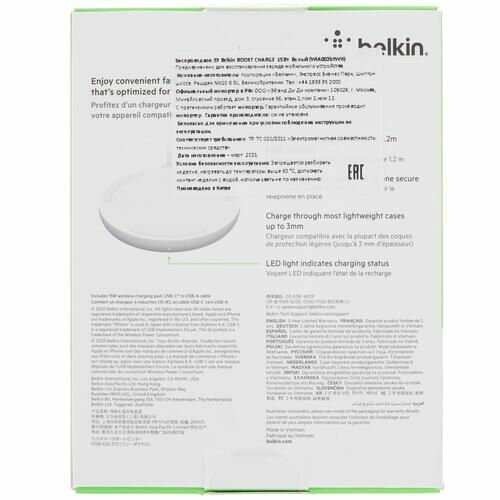 | Дополнительная информация | совместимость: устройства с поддержкой беспроводной зарядки Qi, зарядка через чехол (толщиной до 3 мм) |