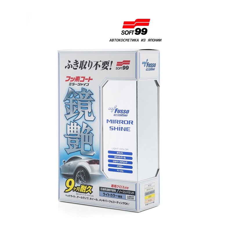 Полироль кузова Soft 99 Fusso Mirror Shine 9 Months, защитный, для усиления блеска светлых автомобилей, бутылка 250мл (+салфетка), арт. 00351