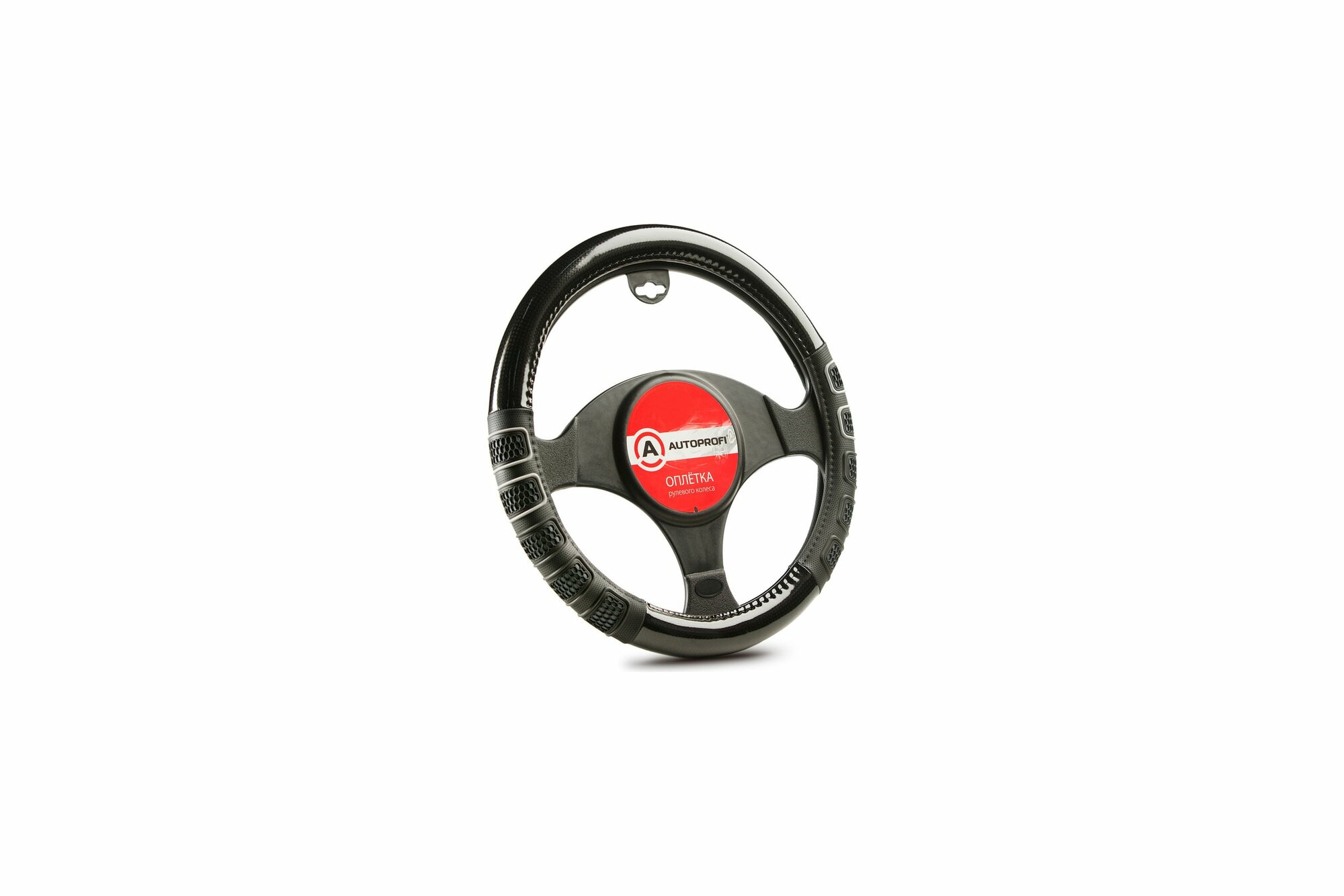 Оплетка на руль AUTOPROFI M 38см экокожа, 3D вставки из мягкого PVC с объем.узором, черн/серая
