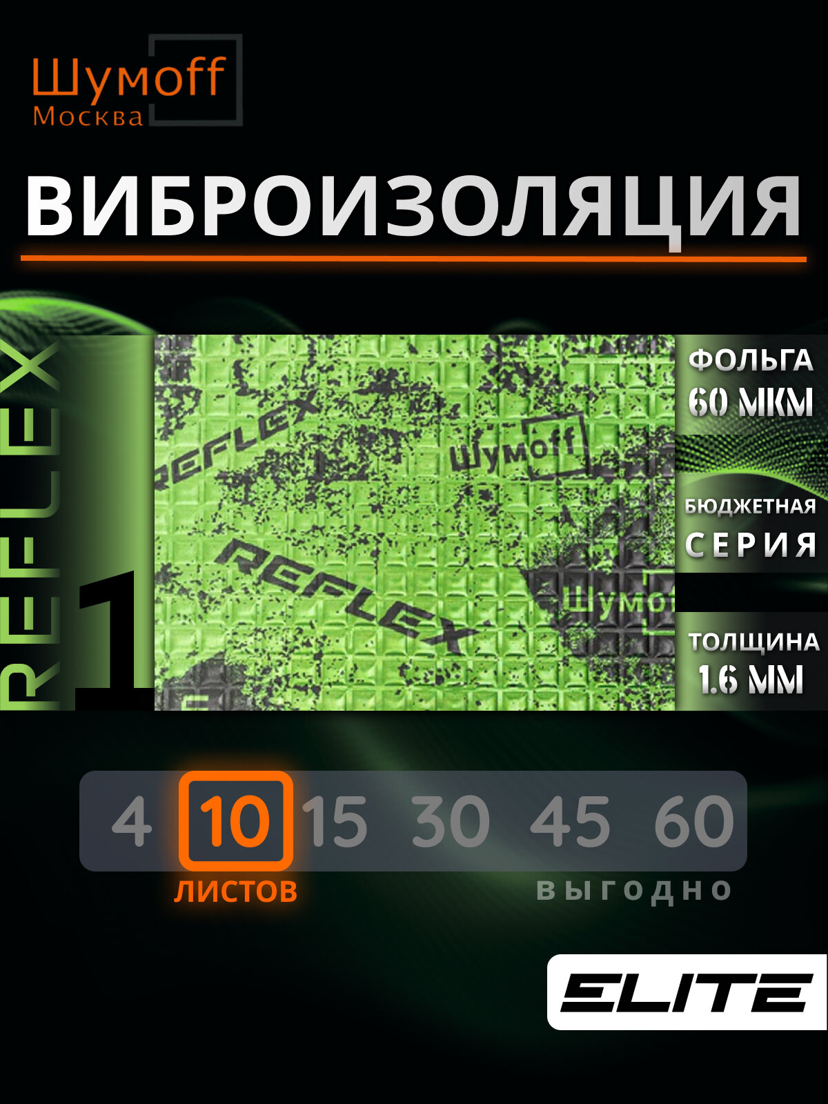 СохранитьВиброизоляция для автомобиля Шумофф Reflex 1 - 10 листов 37.5 см х 23 см Вибродемпфер для потолка, дверей, капота, багажника - толщина 1.6 мм интересное: