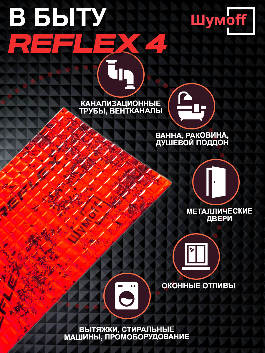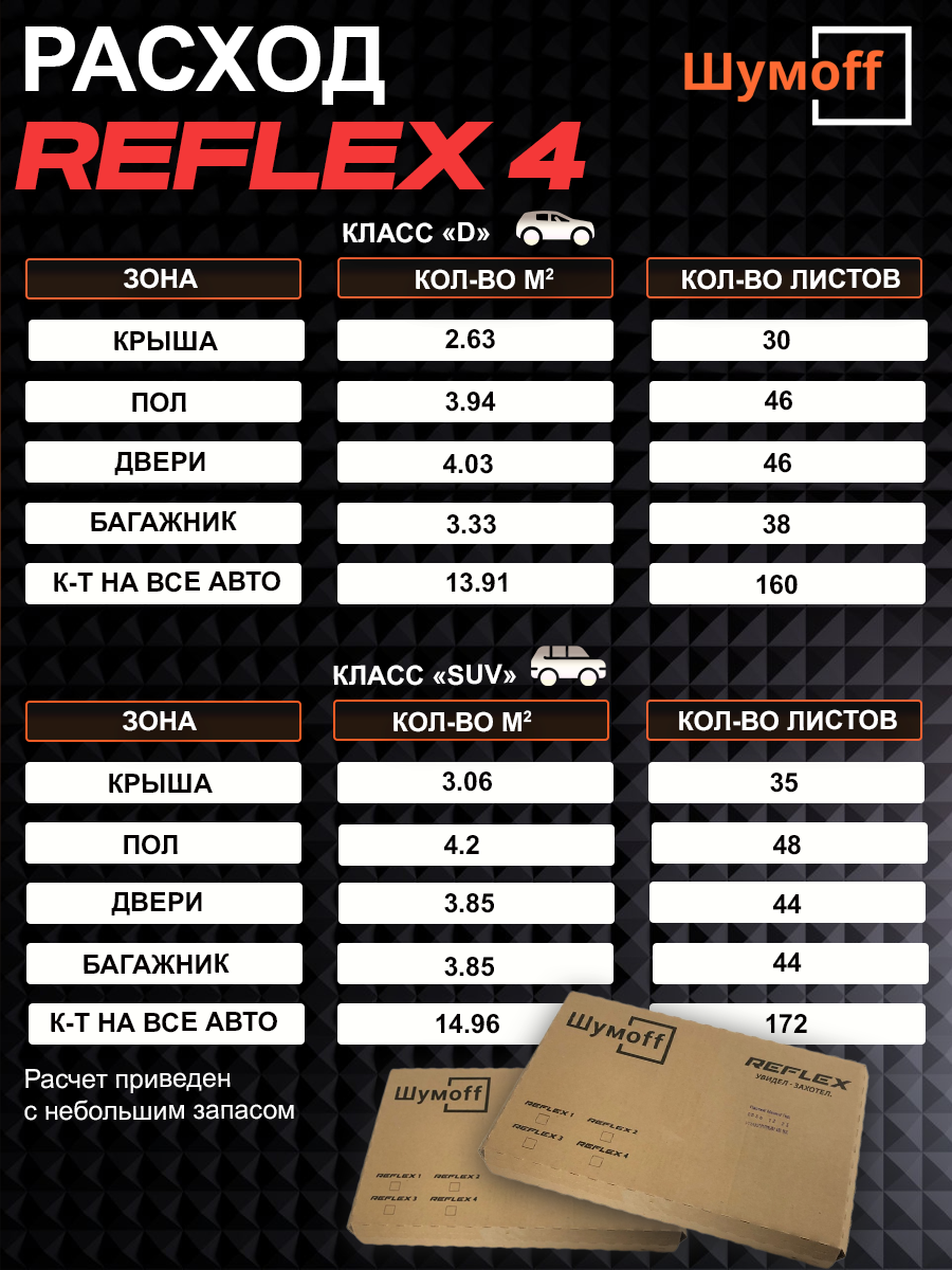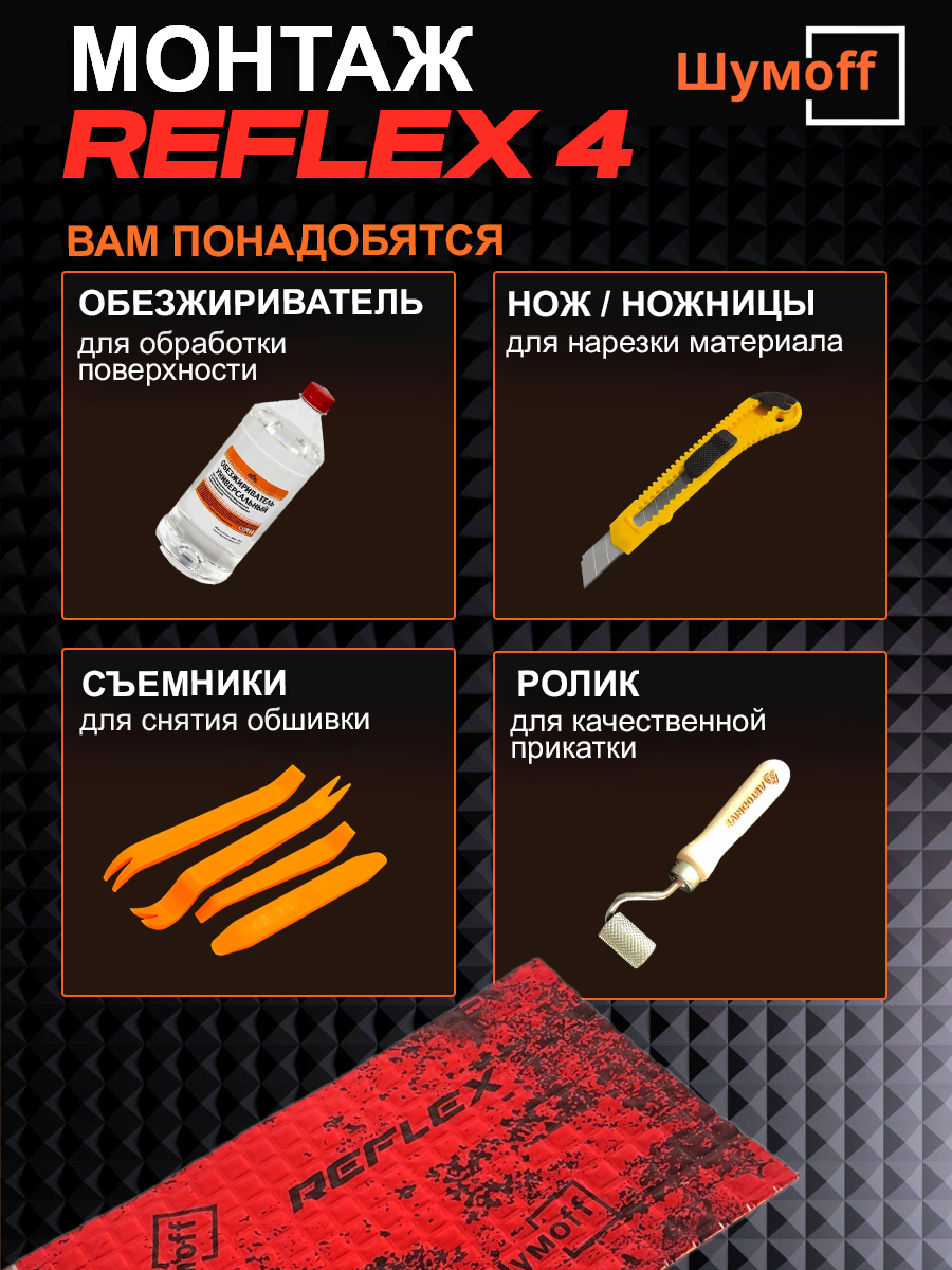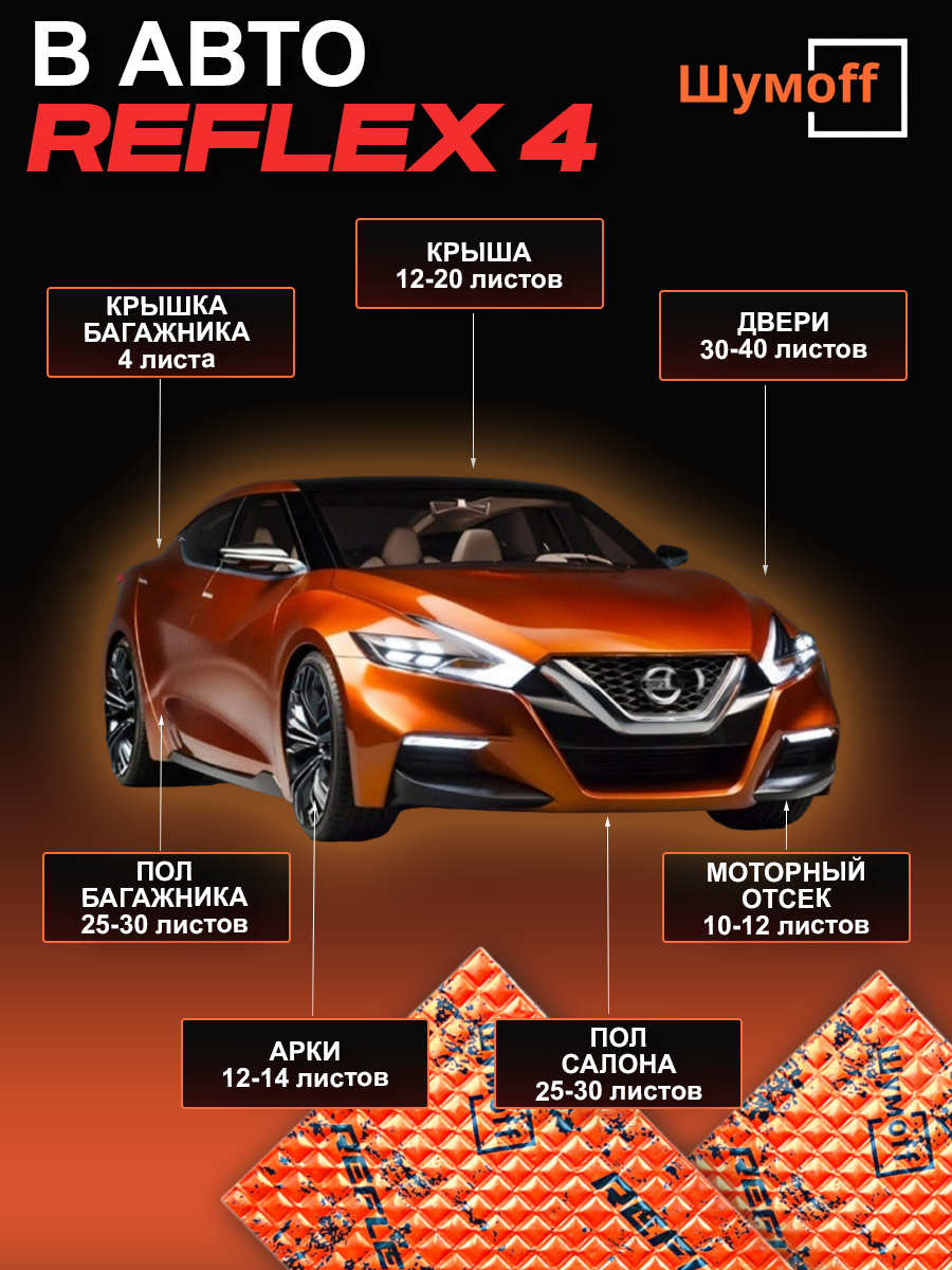 Шумофф Reflex 4 - 14 листов Виброизоляция для автомобиля - для пола, дверей, капота, багажника - толщина 3.6 мм