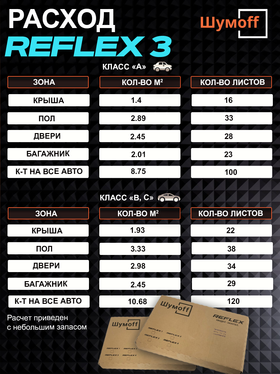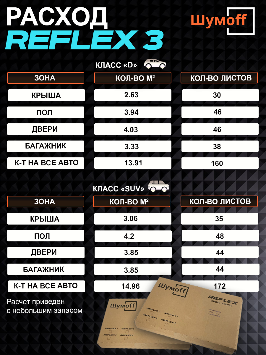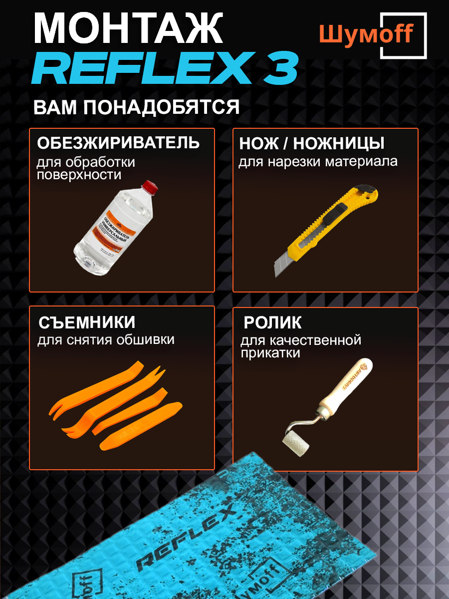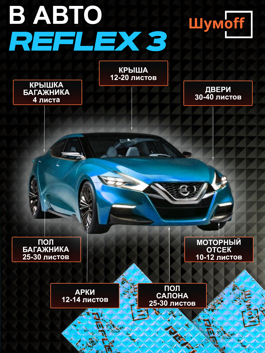 Шумофф Reflex 4 - 14 листов Виброизоляция для автомобиля - для пола, дверей, капота, багажника - толщина 3.6 мм