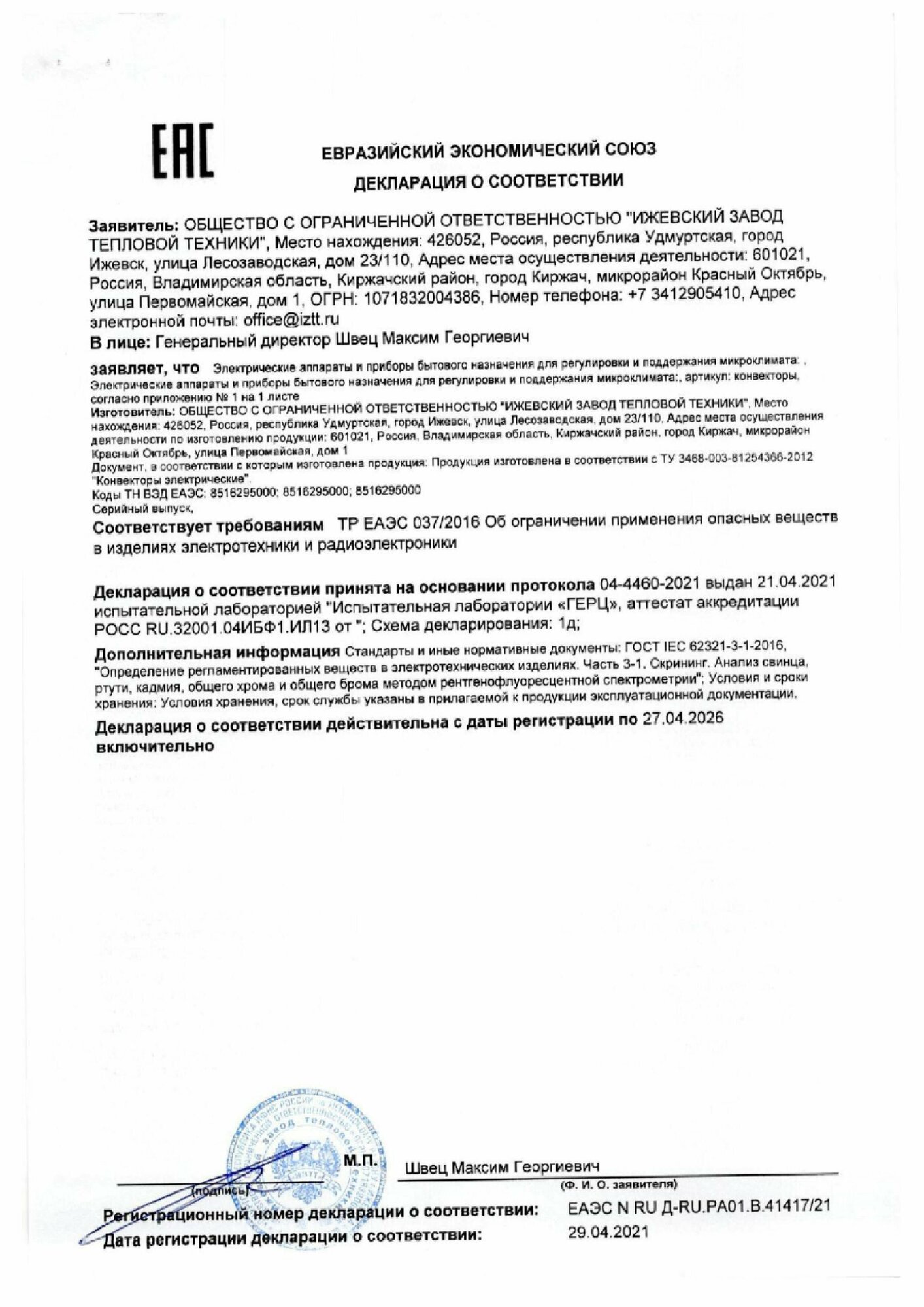 | Дополнительная информация | нагревательный элемент Stitch; регулируемая мощность - 1000/2000 Вт; класс электрозащиты I; степень защиты IP20; размеры конвектора без ножек 83 х 40 х 10,3 см |