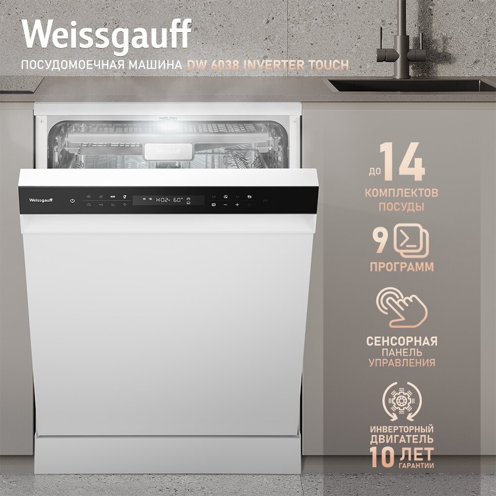 Купить Посудомоечная машина с авто-открыванием и инвертором Weissgauff DW 6038 Inverter Touch,3 года гарантии,3 корзины, 14 комплектов, 9 программ, быстрый режим, режим стерилизации, полная защиты от протечек, Таймер до 24 часов,сенсорное управление