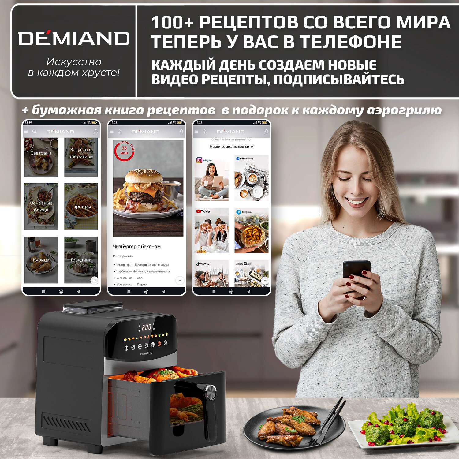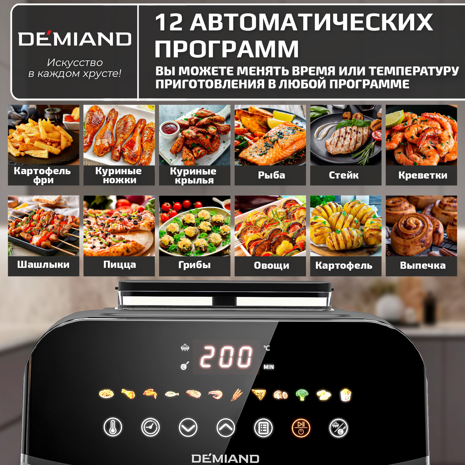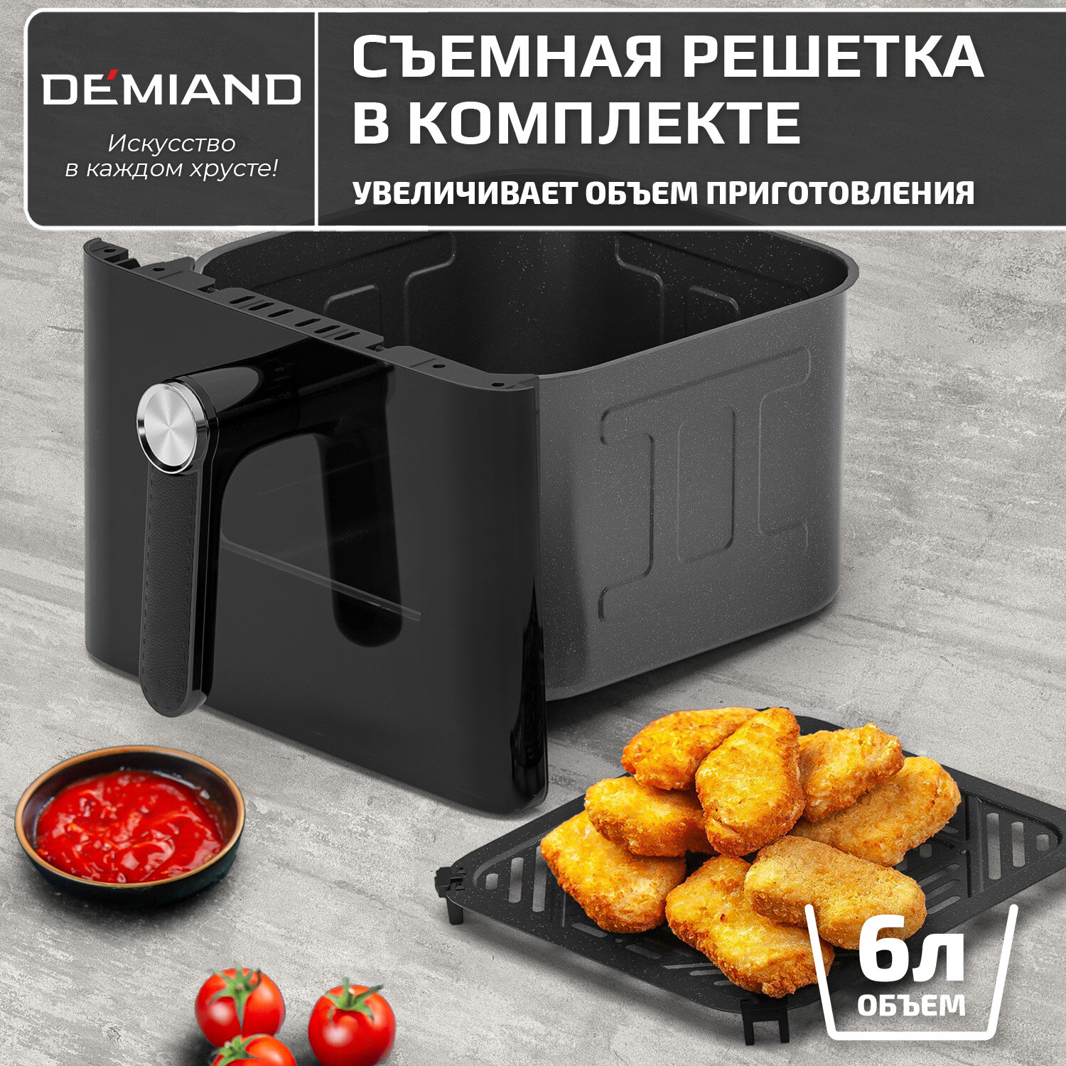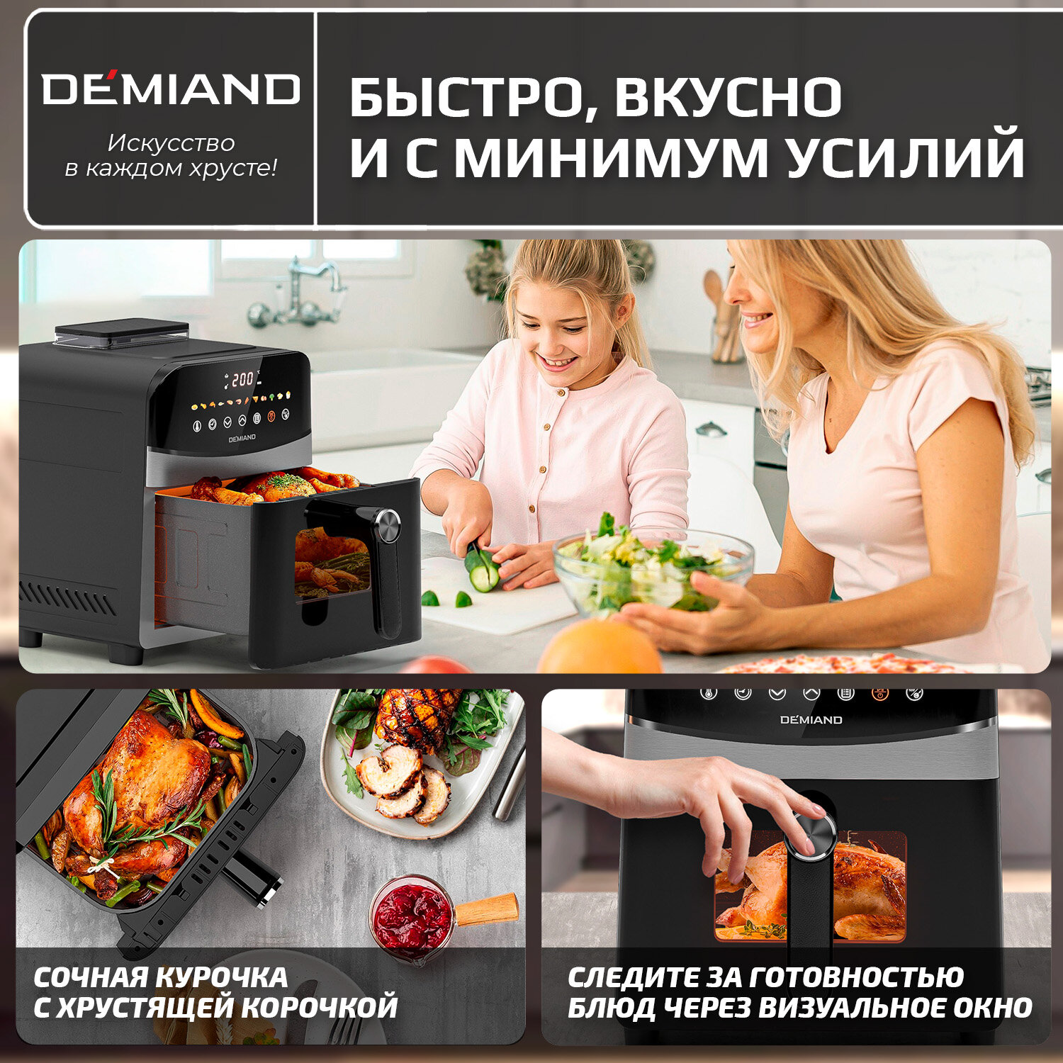 Аэрогриль DEMIAND, с функциями фритюрницы, гриля, духовки, тостера, мини-печи, съемная решетка, корзина, 8 программ, книга рецептов, 4,5л, 1400Вт