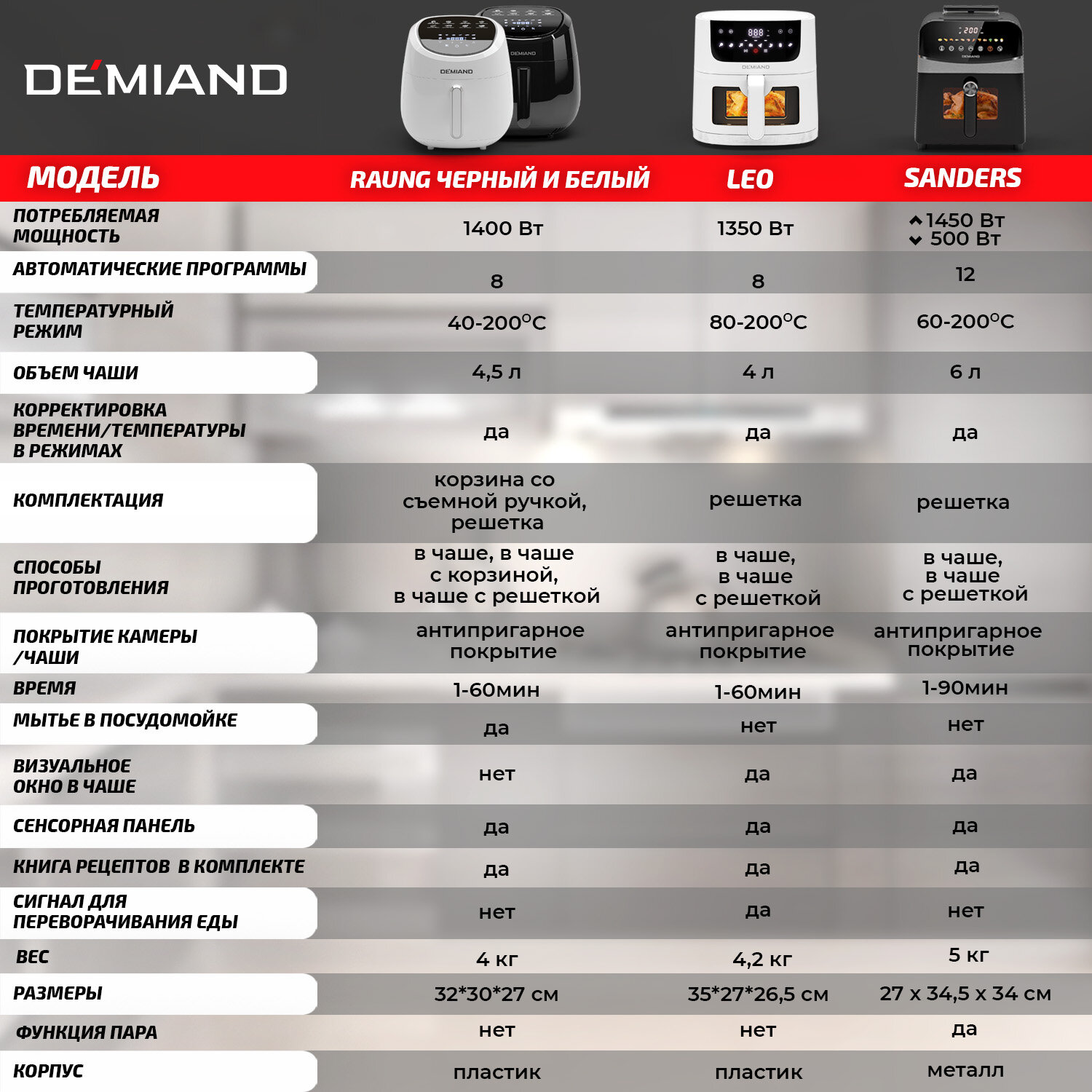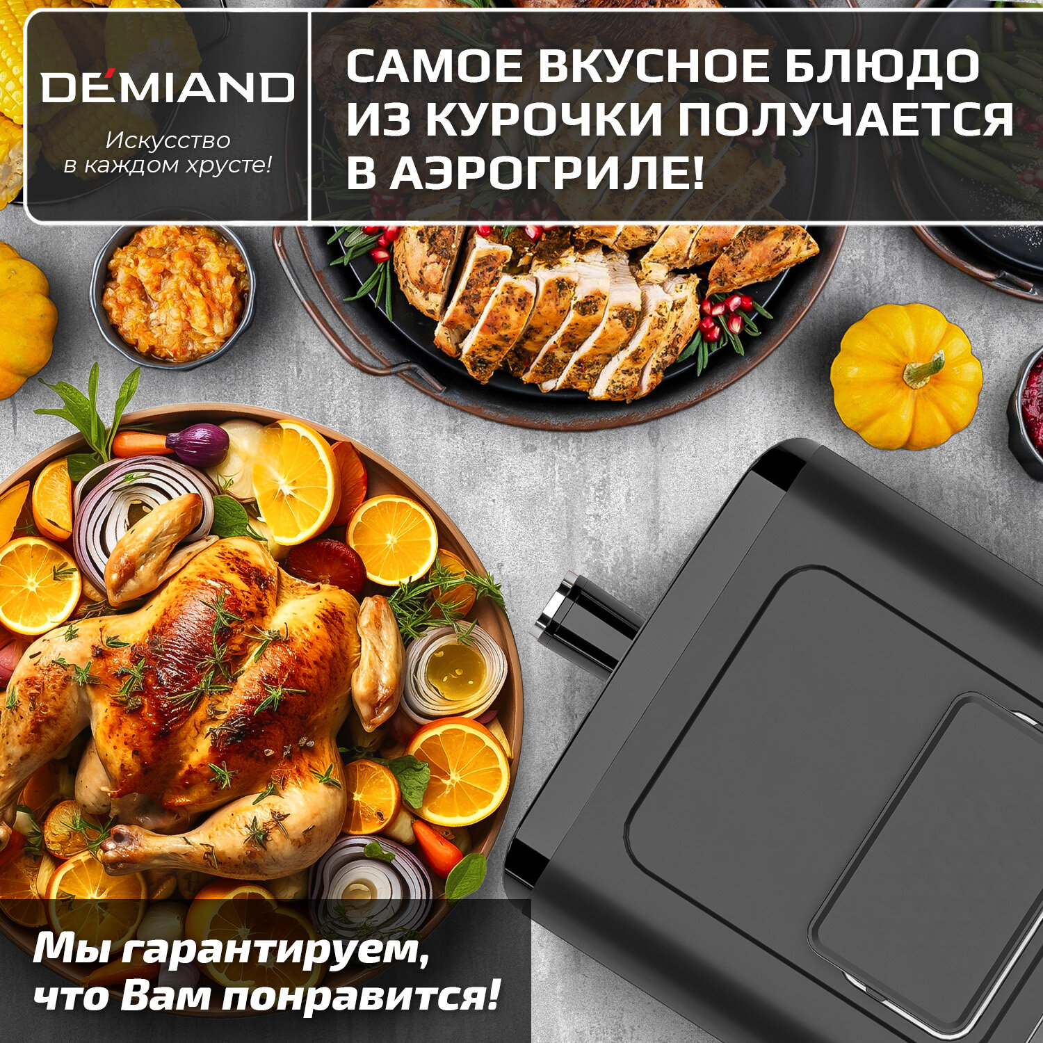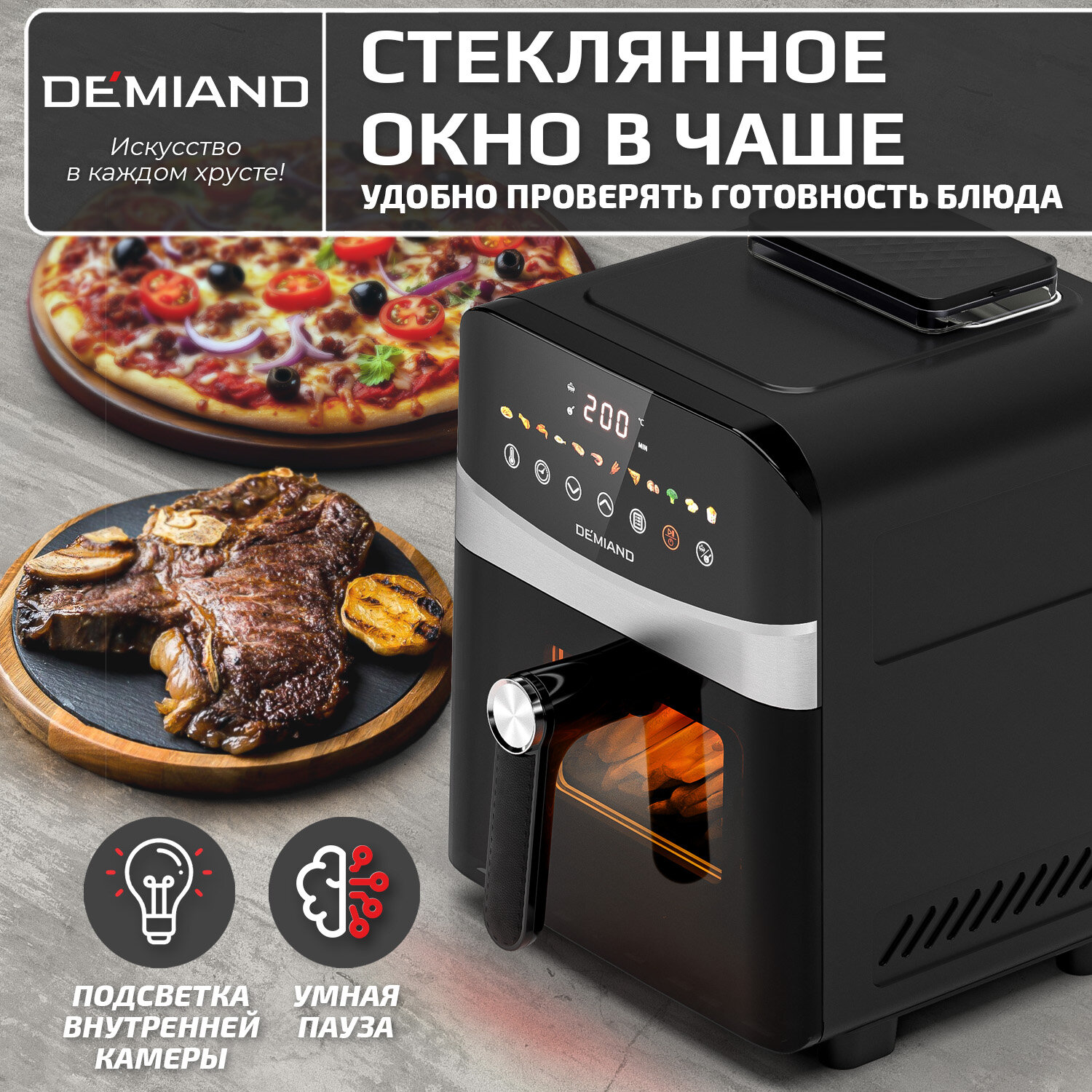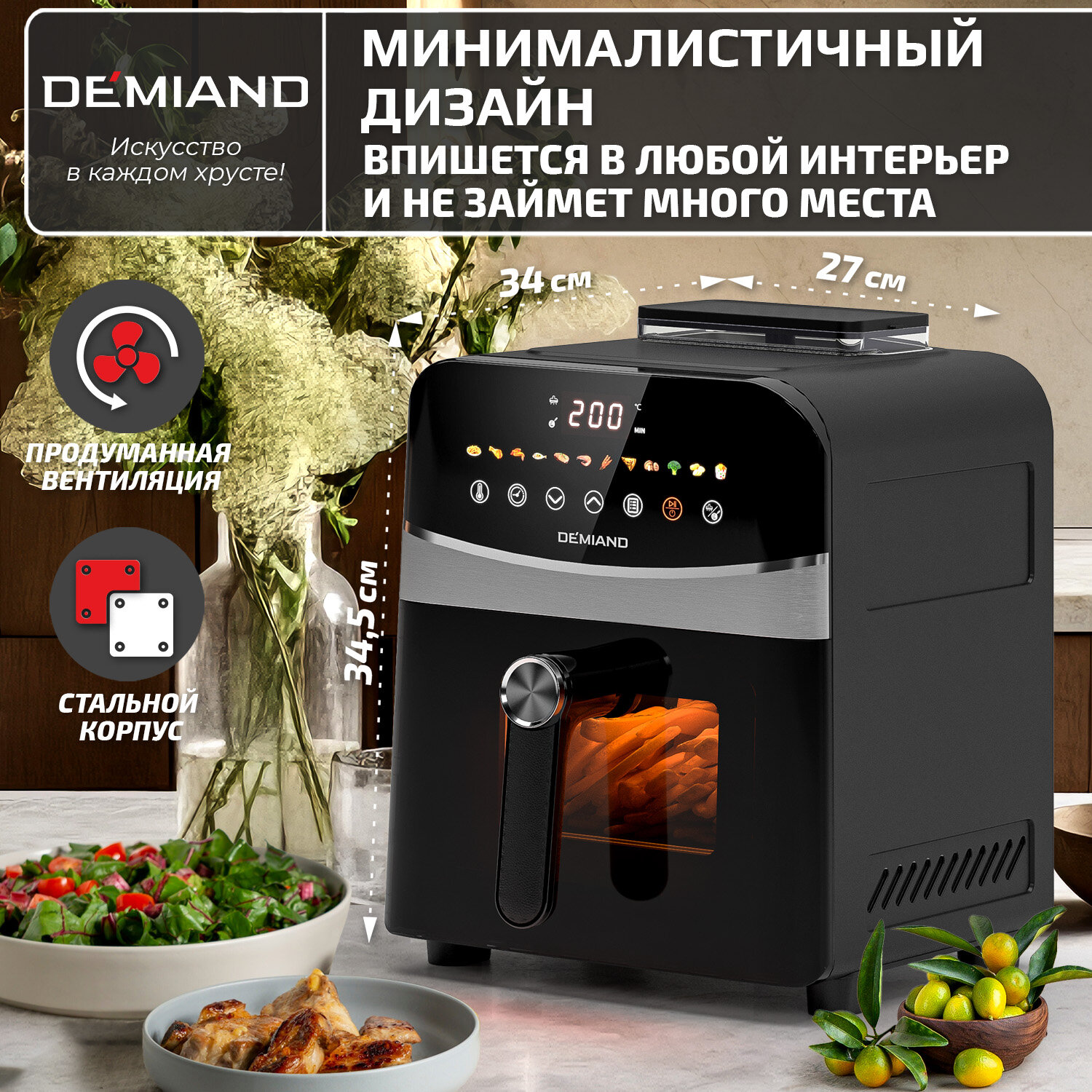 Аэрогриль DEMIAND, с функциями фритюрницы, гриля, духовки, тостера, мини-печи, съемная решетка, корзина, 8 программ, книга рецептов, 4,5л, 1400Вт