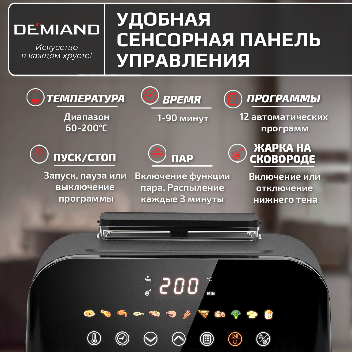 Купить Инновационный аэрогриль Demiand Sanders с уникальной технологией приготовления Жарки на Пару - Steam Fry-Up ,12 программ, визуальное окно, съемная решетка, верхний и нижний тэн, внутренняя камера из стали, объем 6 литров, 1950W, DK-2200, черный