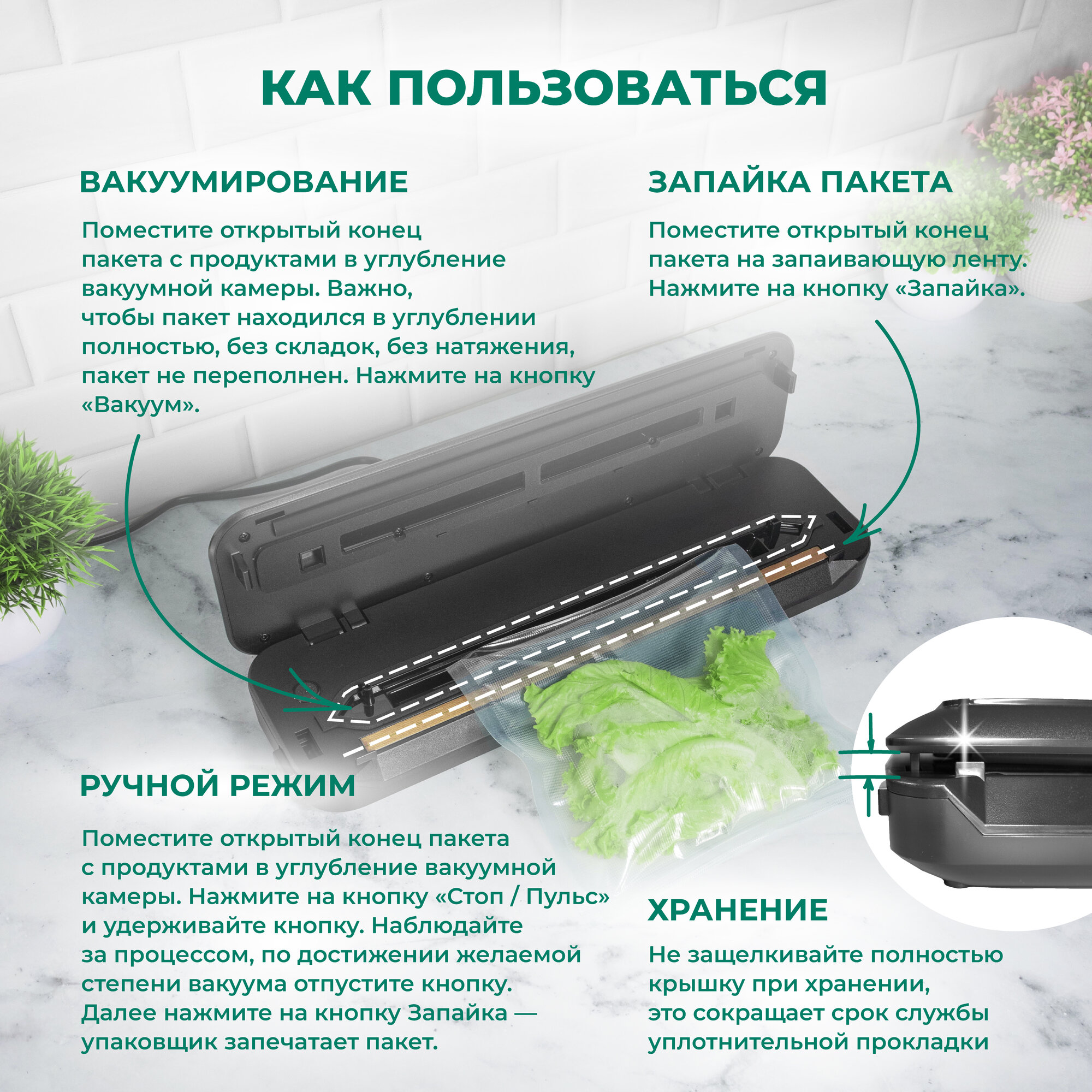 Вакуумный упаковщик SunKit SealMe S-60 с резаком, управление на русском, 7 режимов работы, мощный насос / Домашний вакууматор для продуктов - Бирюзовый