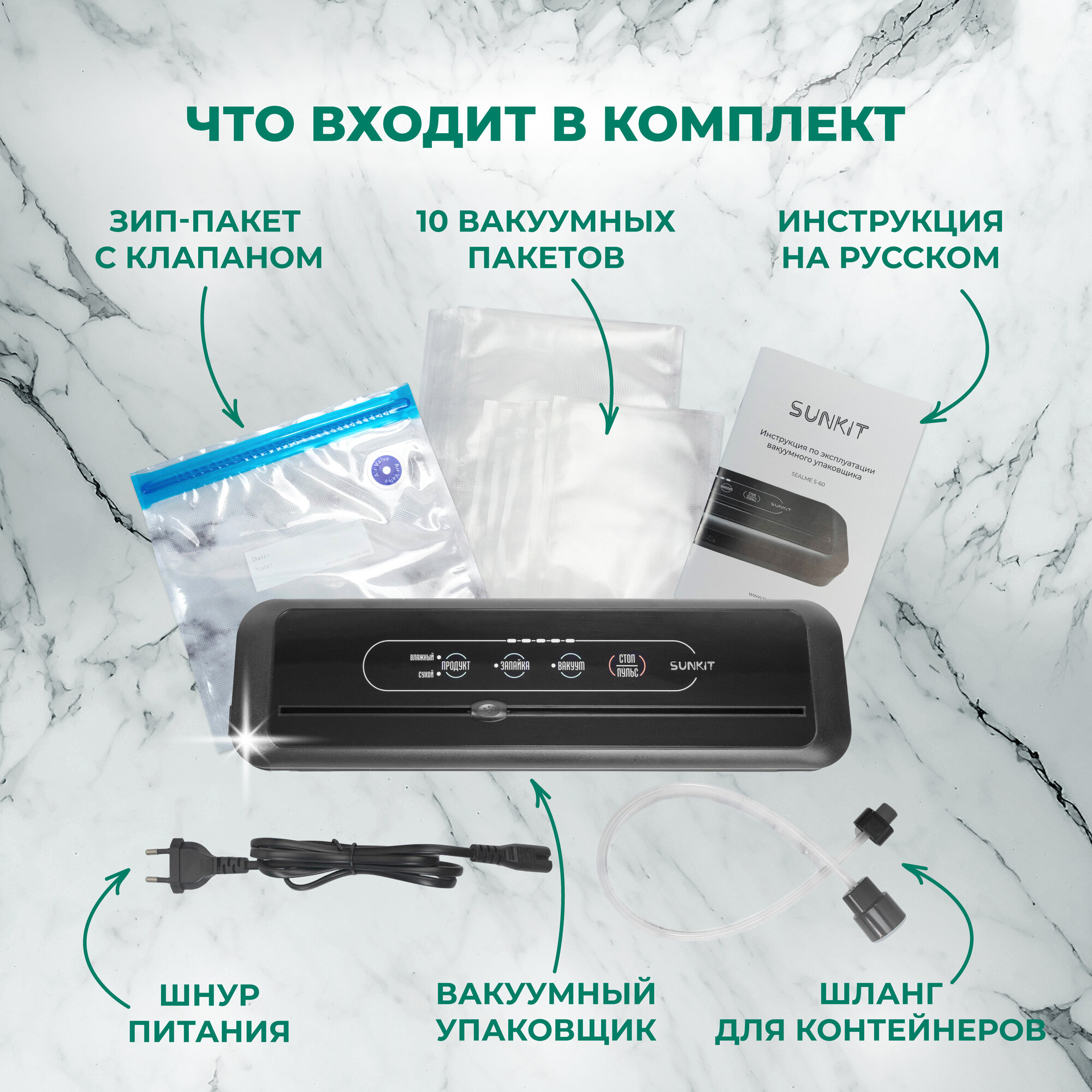 | Подробная комплектация | Вакуумный упаковщик SunKit SealMe S-60; Трубка для вакуумирования ёмкостей (вакуумных контейнеров, зип-пакетов, бутылок); 10 вакуумных пакетов (15х20 см - 5 шт. и 20х30 см - 5 шт.); Шнур питания; Инструкция на русском языке. |