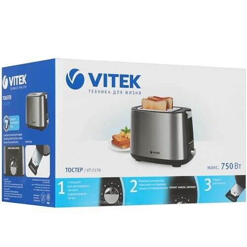 Купить Тостер Vitek VT-7170 серебристый, 750 Вт, тостов - 2, подогрев, размораживание