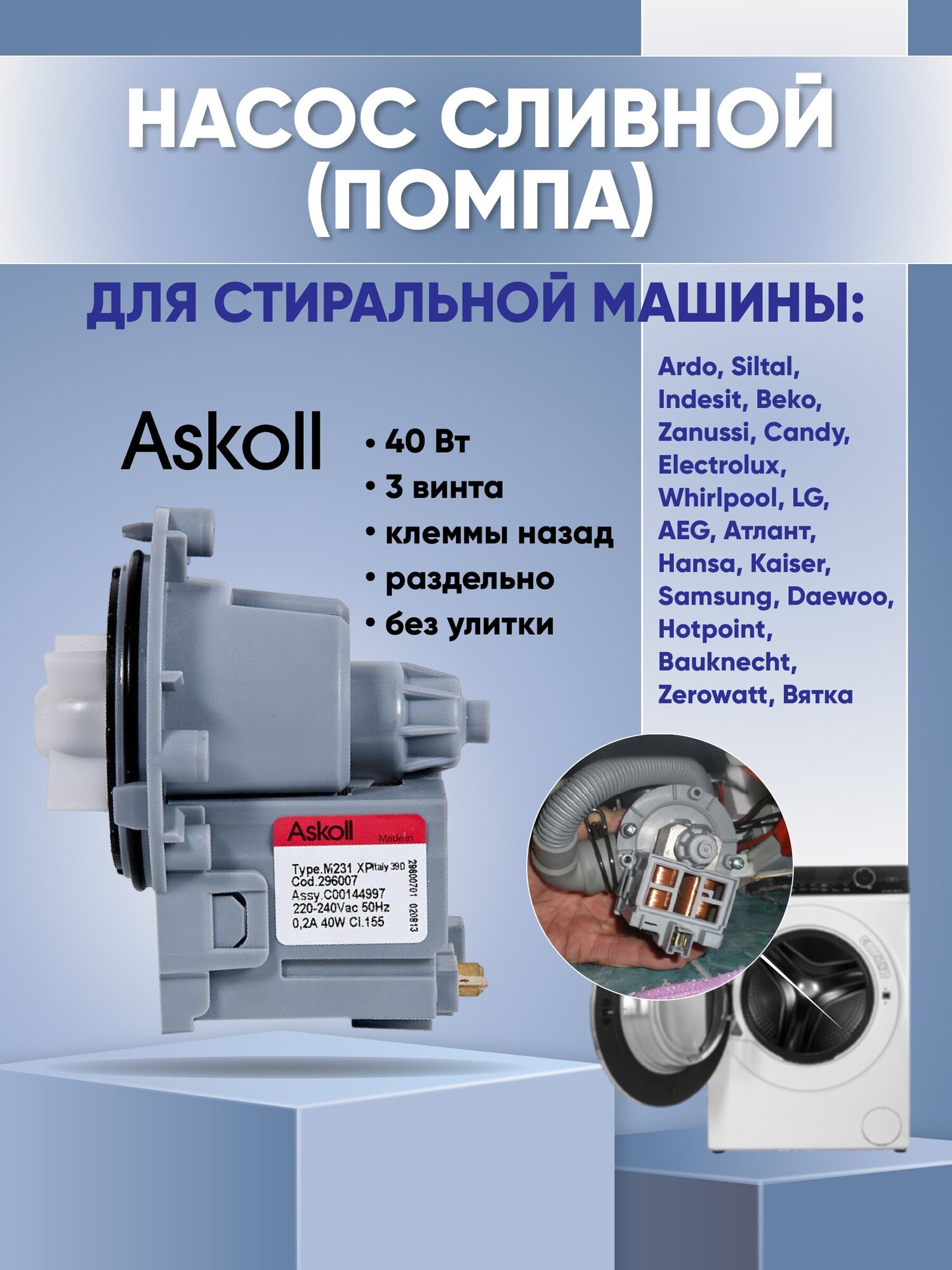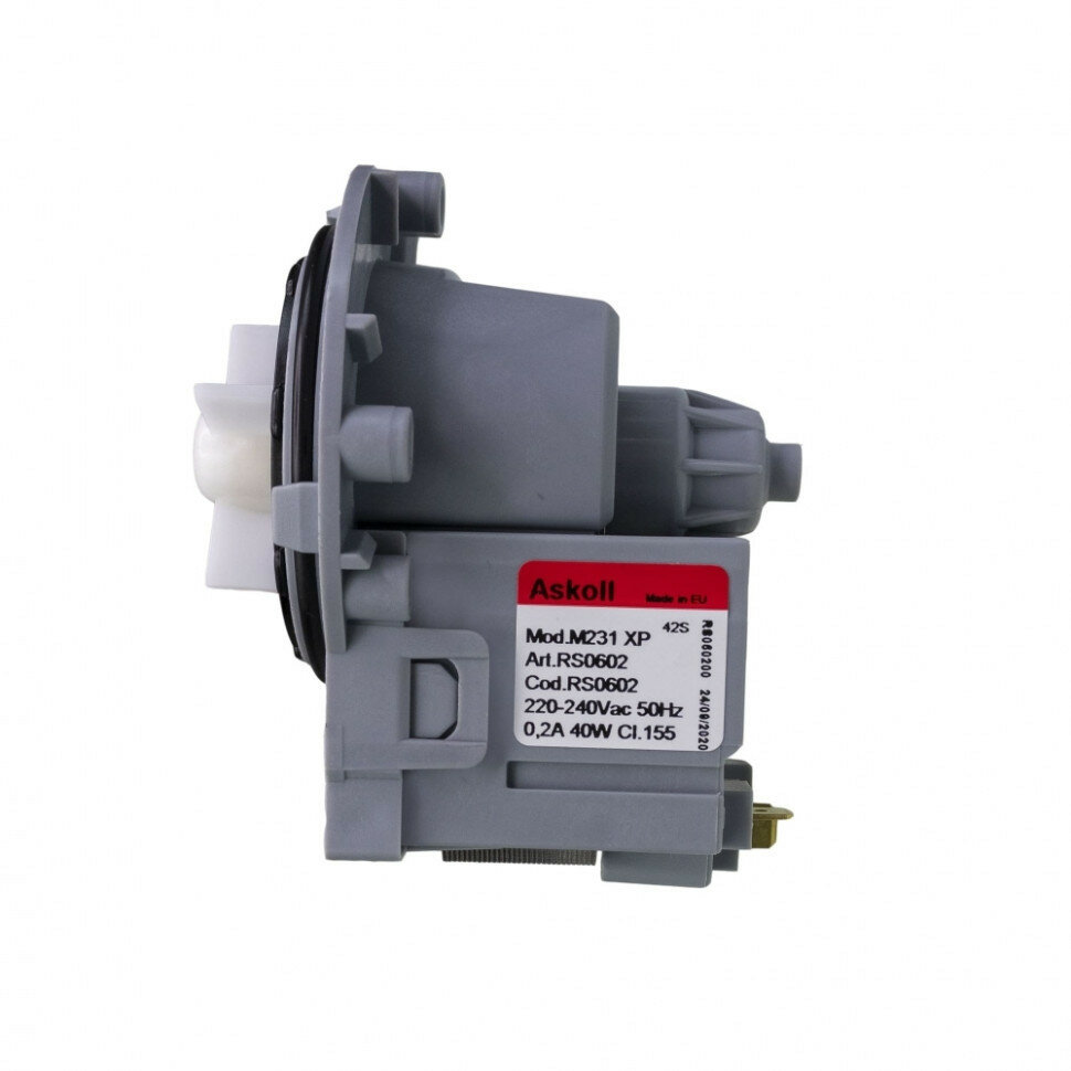 Универсальная помпа (насос) 40W, Askoll для Ariston, AEG, Indesit, Electrolux, Zanussi, Candy, LG, Bosch, Whirlpool, Samsung, клеммы сзади раздельно, на винтах, 220V (Mod.M231 XP, PMP000UN)