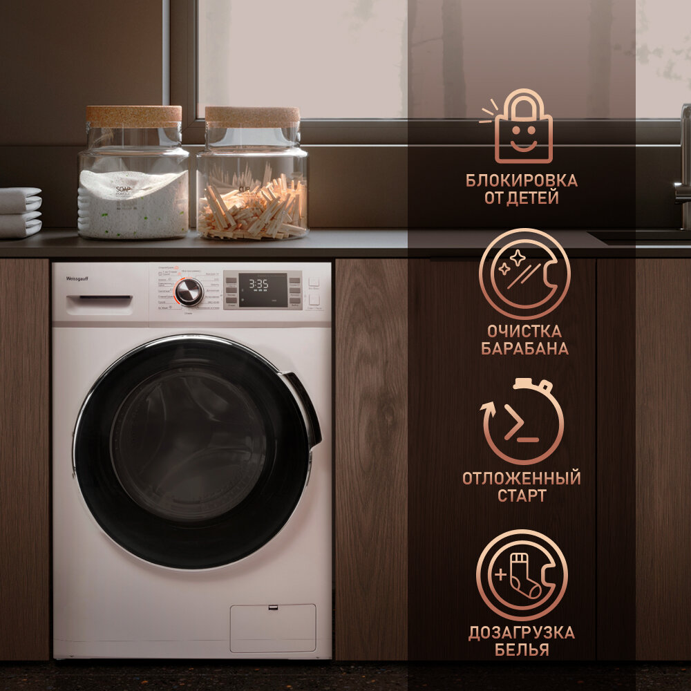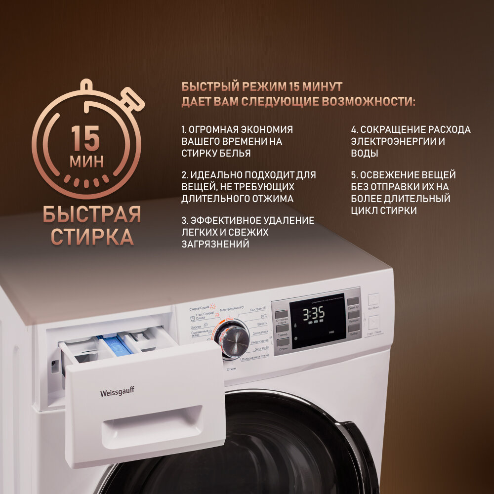 Стиральная машина WEISSGAUFF WMD 4748 DC Inverter, с фронтальной загрузкой, 8кг, 1400обмин, с сушкой, инверторная интересное: