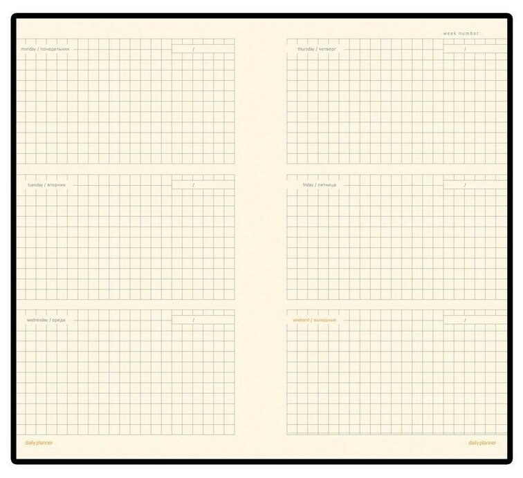 | Минусы: | мне не очень нравится цвет бумаги и выходные бы разделила всё-таки на субботу и воскресенье. |