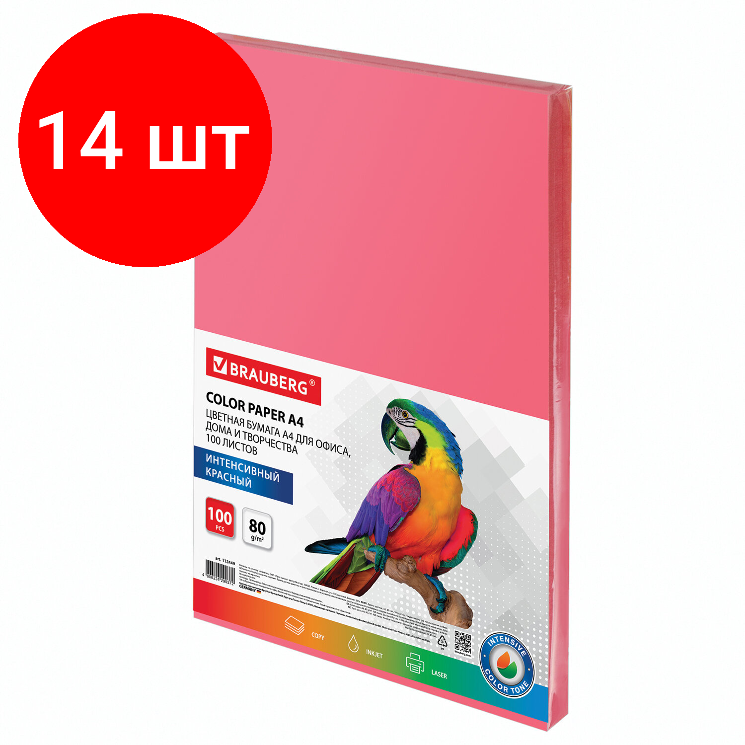 Купить Комплект 14 шт, Бумага цветная BRAUBERG, А4, 80 г/м2, 100 л., интенсив, красная, для офисной техники, 112449